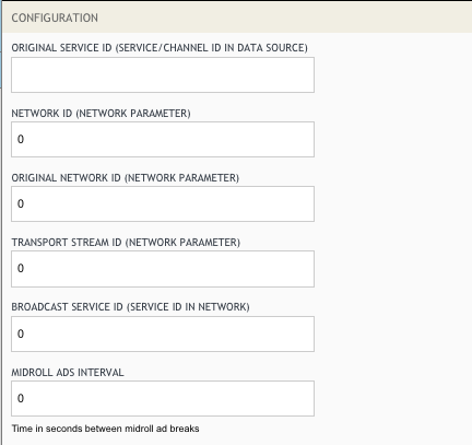 | 5 | BROADCAST SERVICE ID | DVB parameter, needed when used with the broadcast channels | No |
