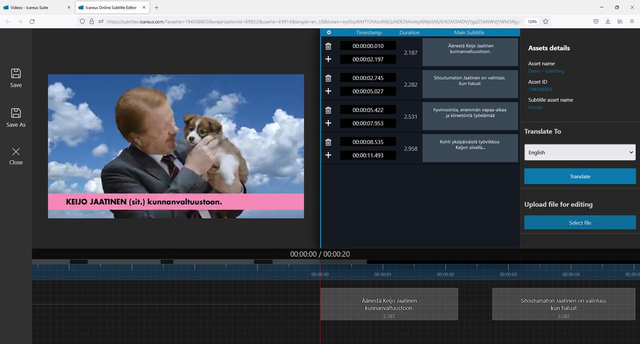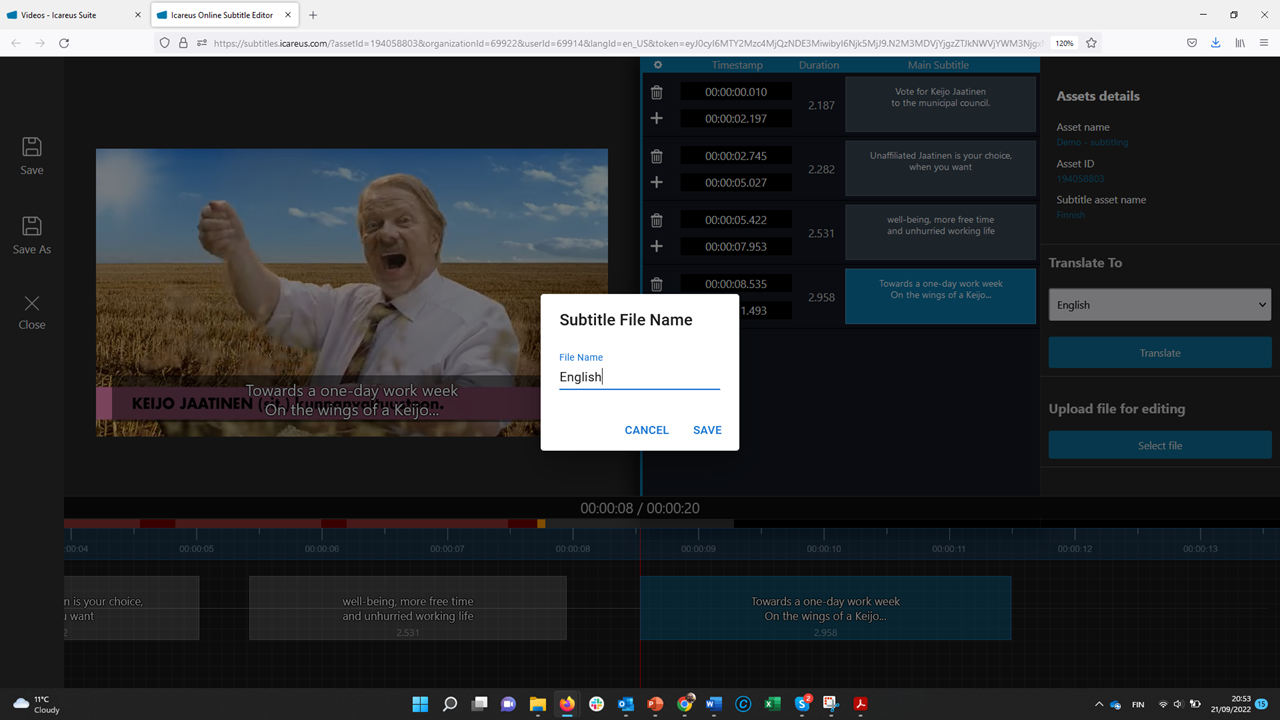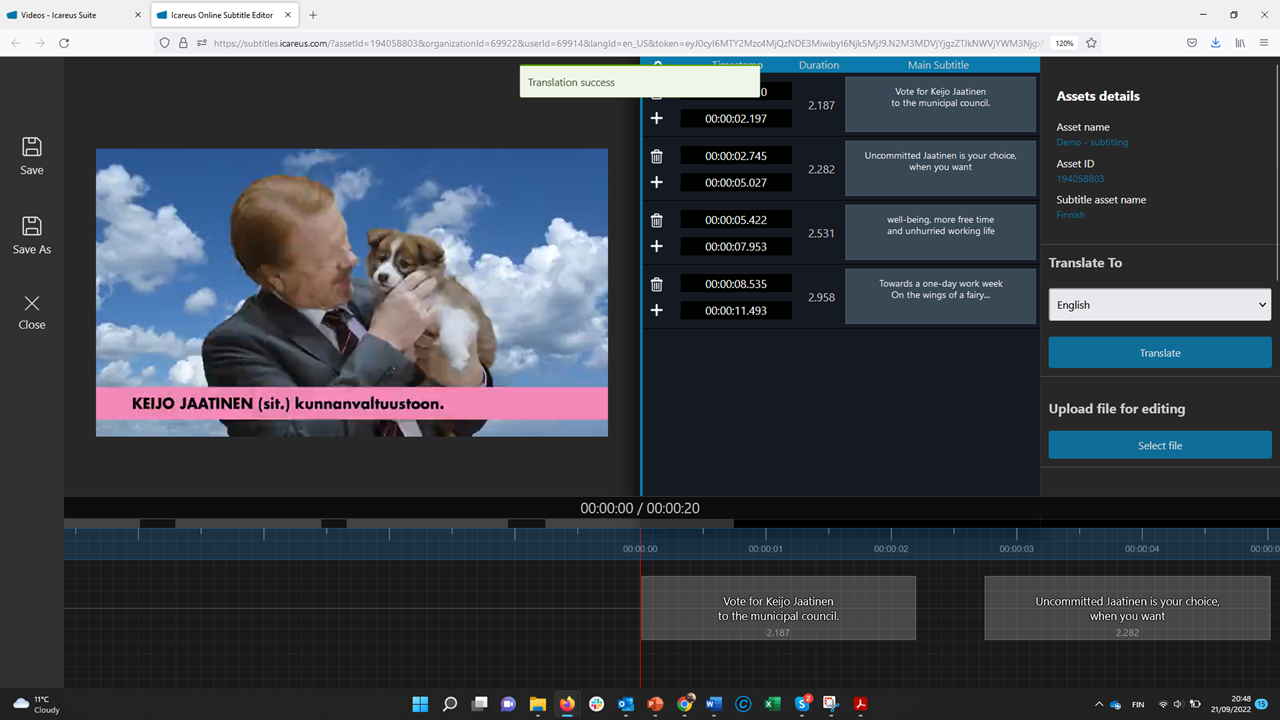 The translation starts by opening the existing subtitle file. This way the admin user does not need to redo the time consuming timing work again.