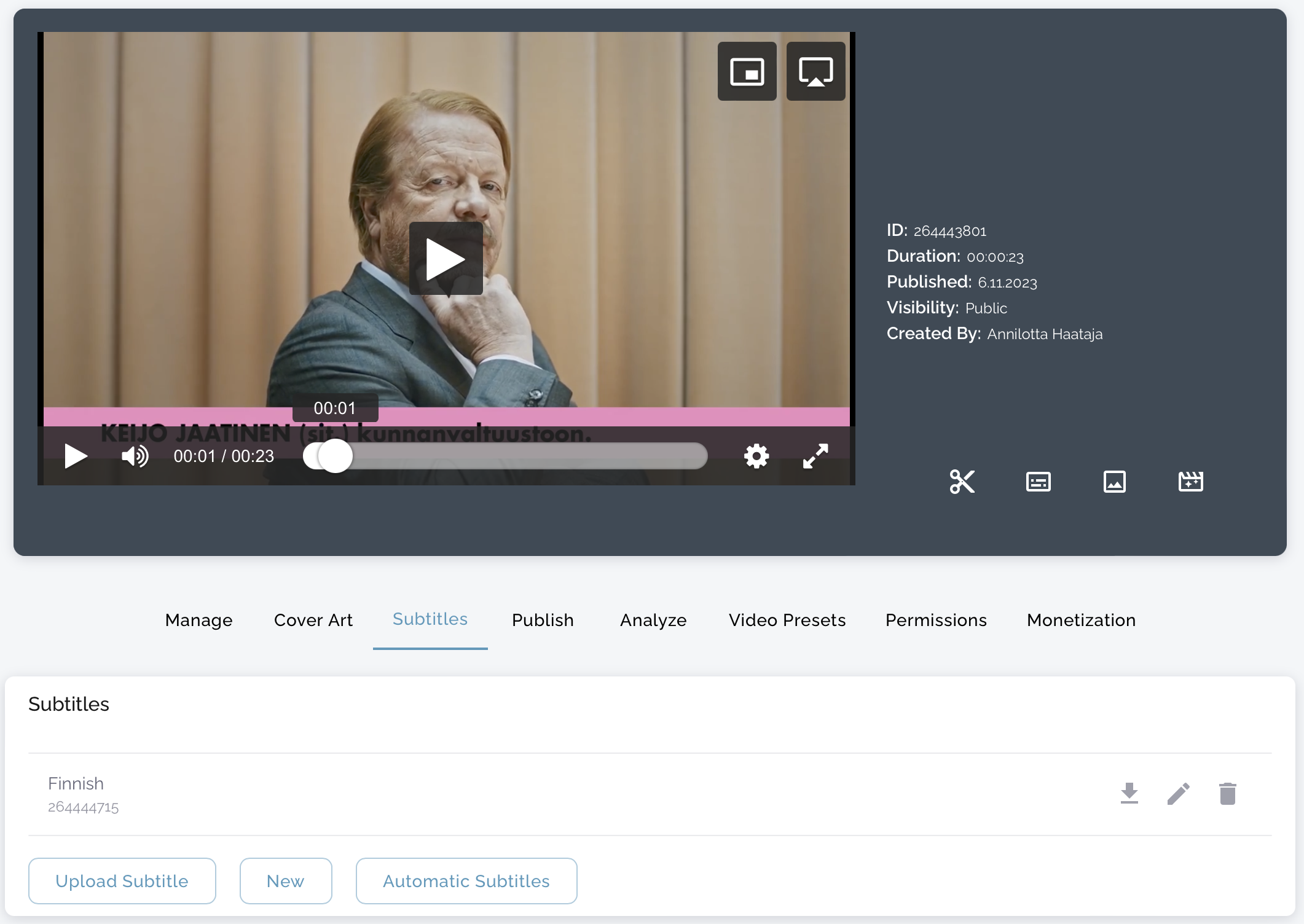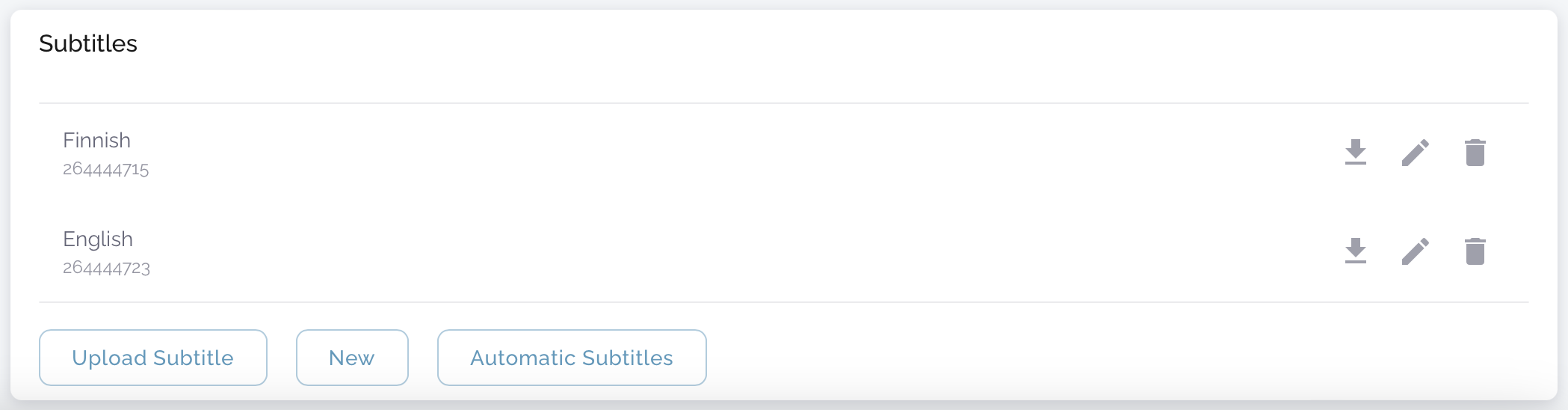 Open the existing subtitle file from Icareus Video Cloud by clicking the 'Edit' button, the middle icon of the three to the right of the subtitle file name.