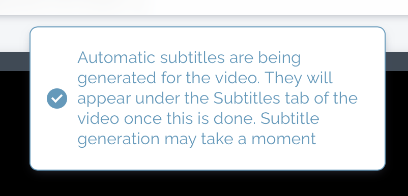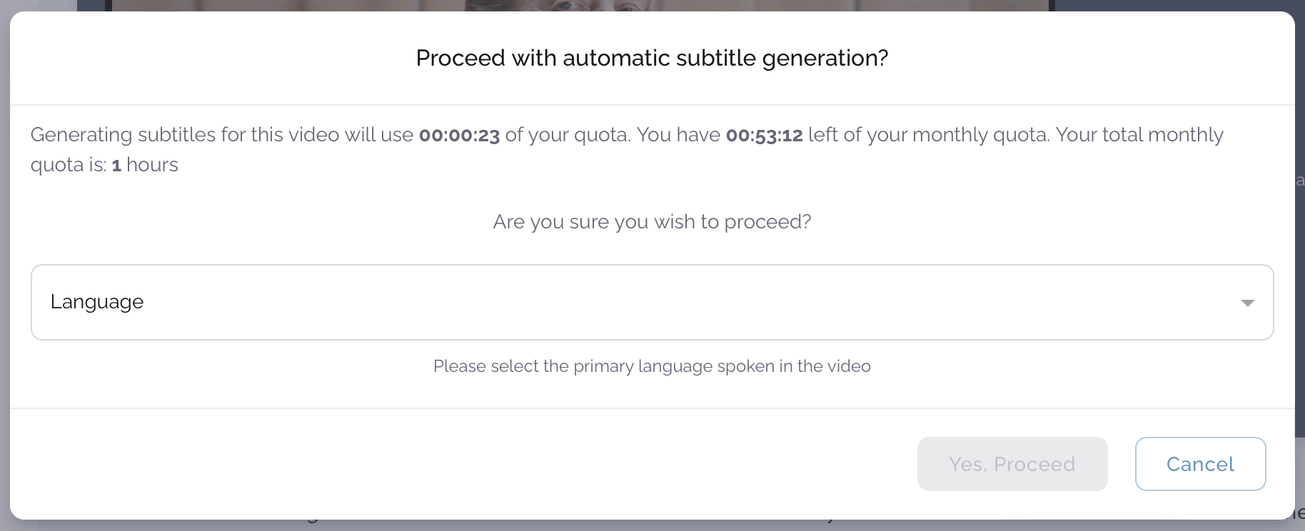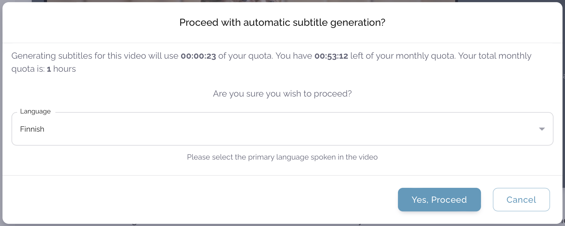 The modal will ask if you wish to proceed with automatic subtitle generation. Proceeding will use up your monthly quota of this automatic subtitle generation service by an amount equal to the length of the video.