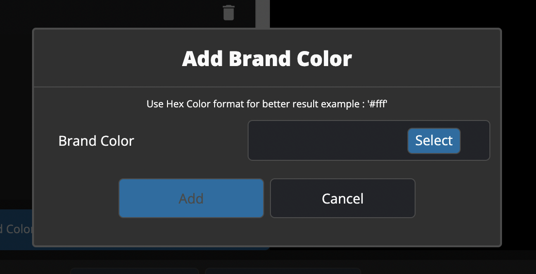 RGB values. Click the "Select" button when you're done to select the color. This will return you to the "Add Brand Color" pop-up, and the color you've selected will appear in the text field as a hex code. Click "Add" to enter the color to you brand colors.