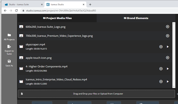 Brand Elements list includes the info about the files including name, (video / audio length) file type (icon) and file format.