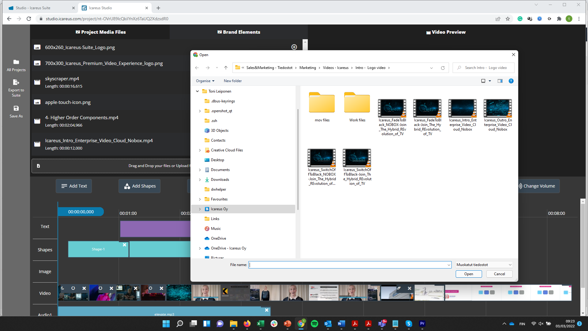 Brand Elements can be added to the timeline like any other media files ie. by pushing the + button at the right end of the file box: