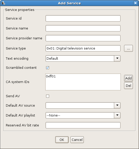 Select 'Scrambled content' option to set free_CA_mode flag to 1 for a service. Once the option is selected, it is possible to specify a set of CA system ids for the service. A CA identifier descriptor will be added to the service with the list of CA system ids defined in this dialog.