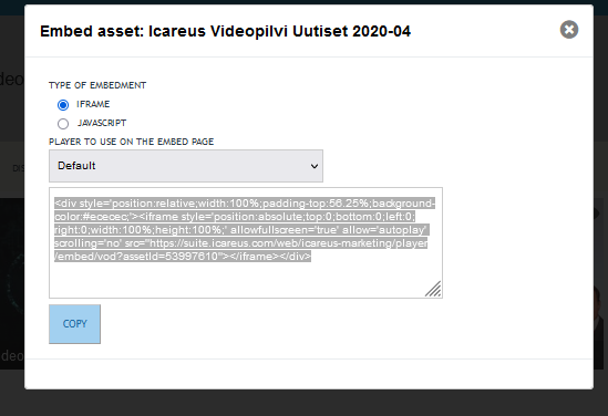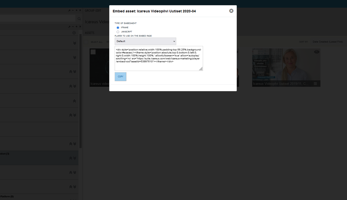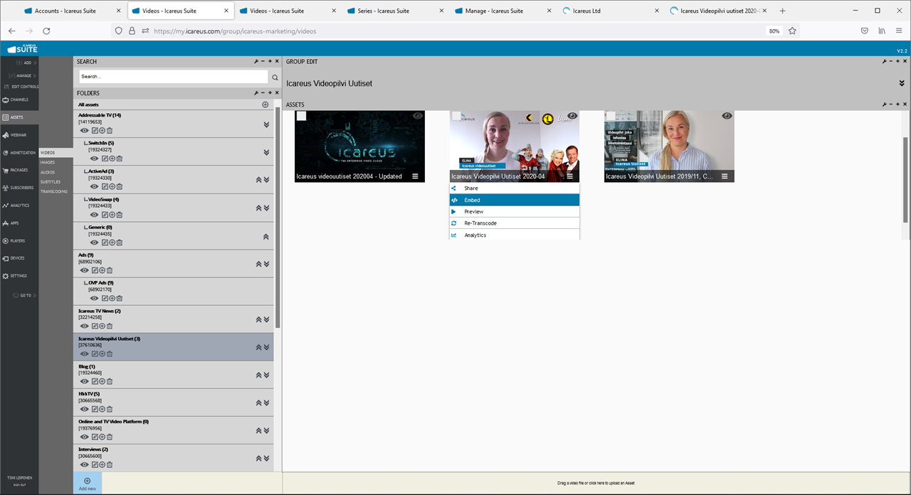 Go to your Icareus Suite account -> Assets and find the find video you want to embed: