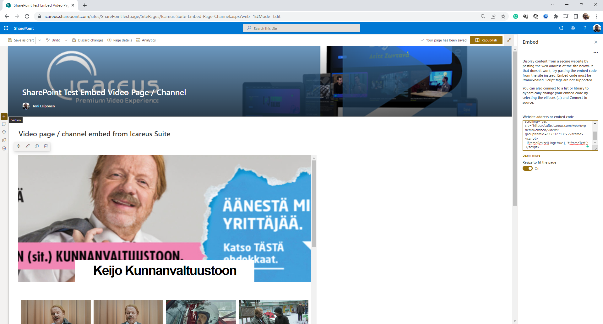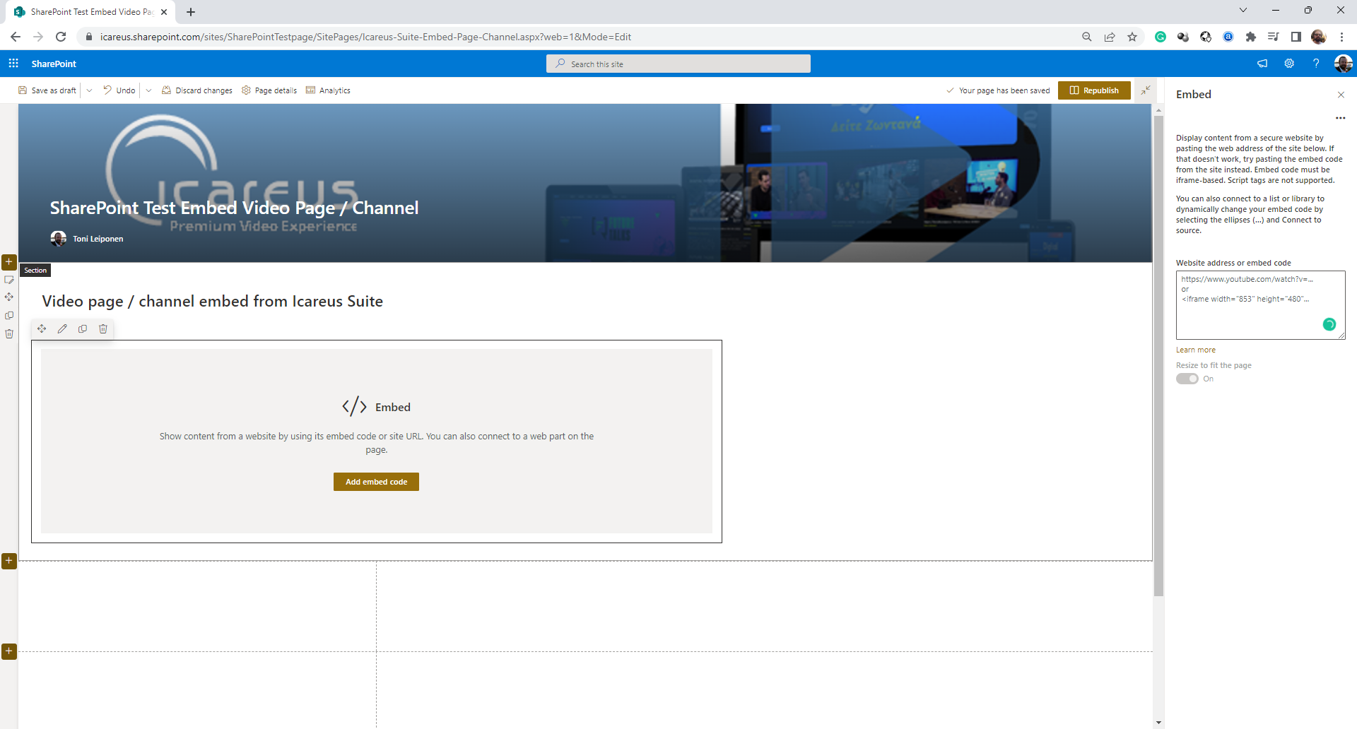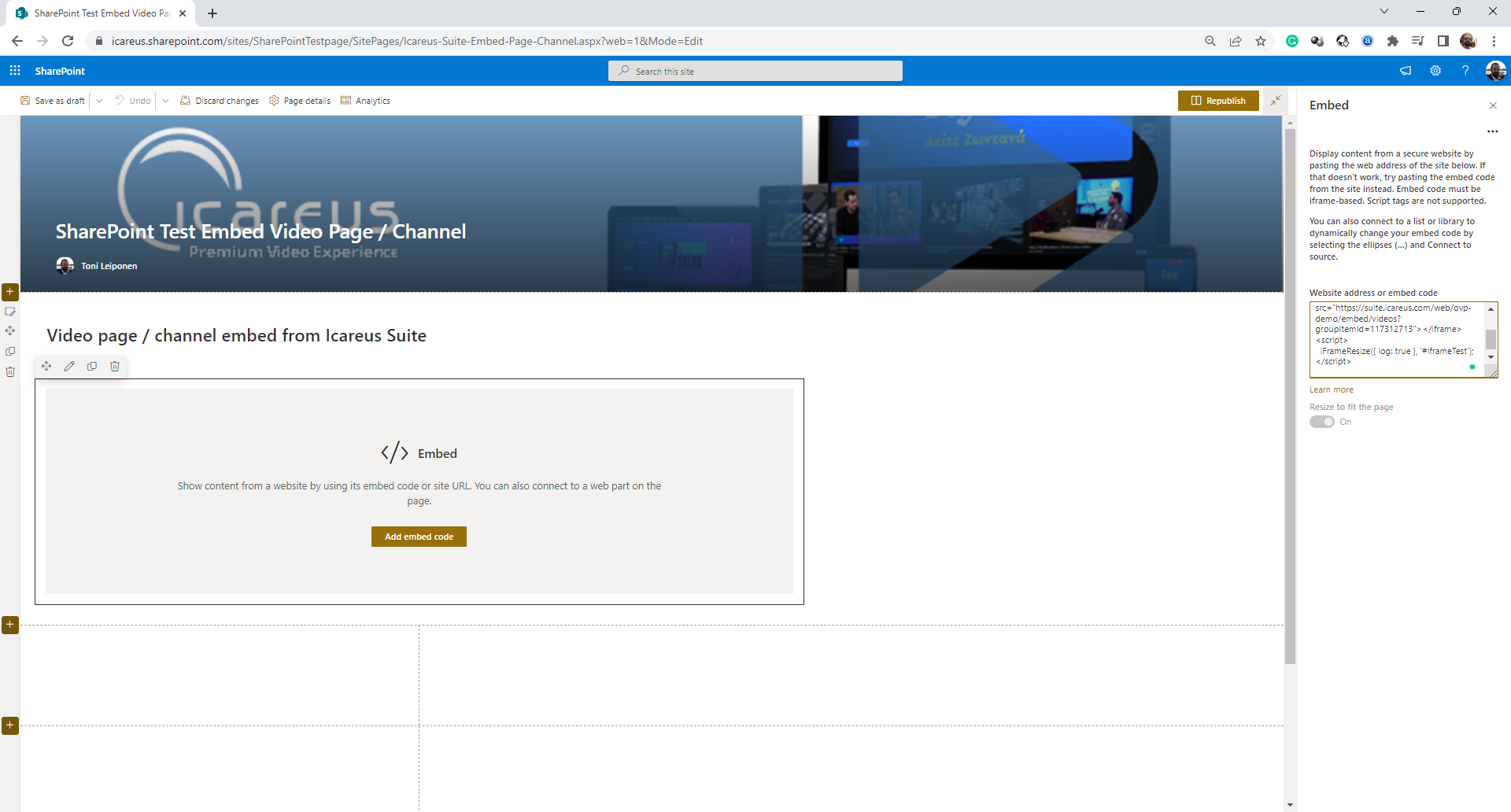 There are two steps that needs to be done when embedding videos from Icareus Suite to SharePoint: