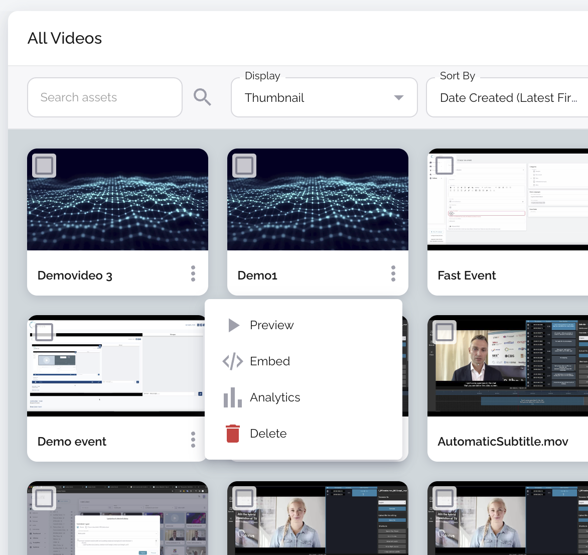 Open your Video Cloud account, go to Media Library -> Videos and click the menu icon in the bottom right corner of the video you want to embed: