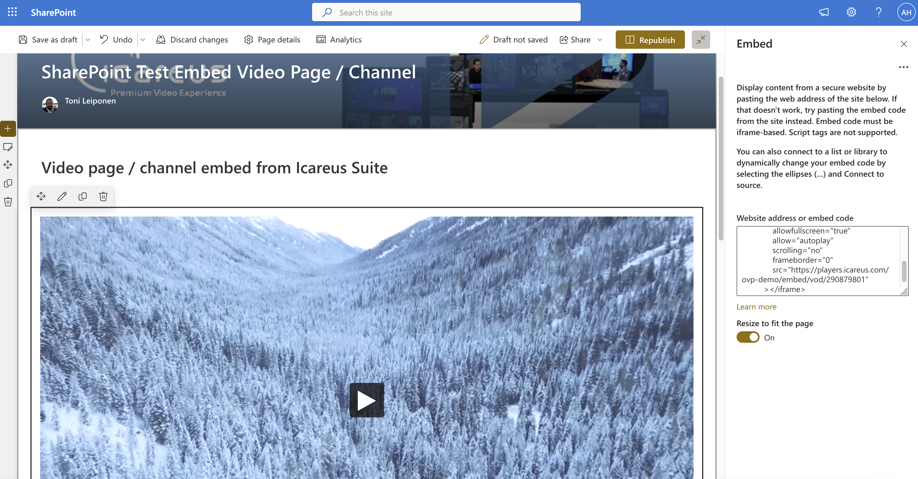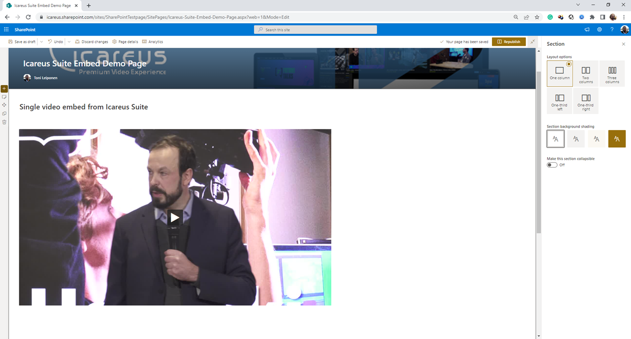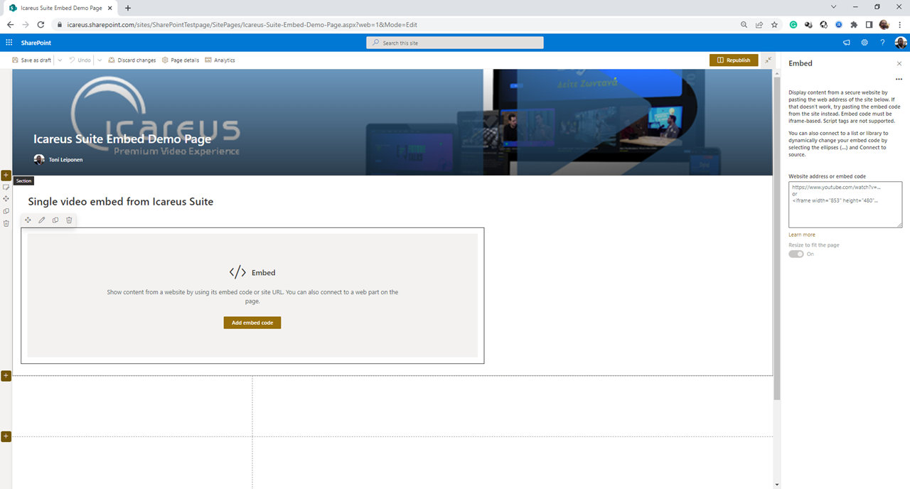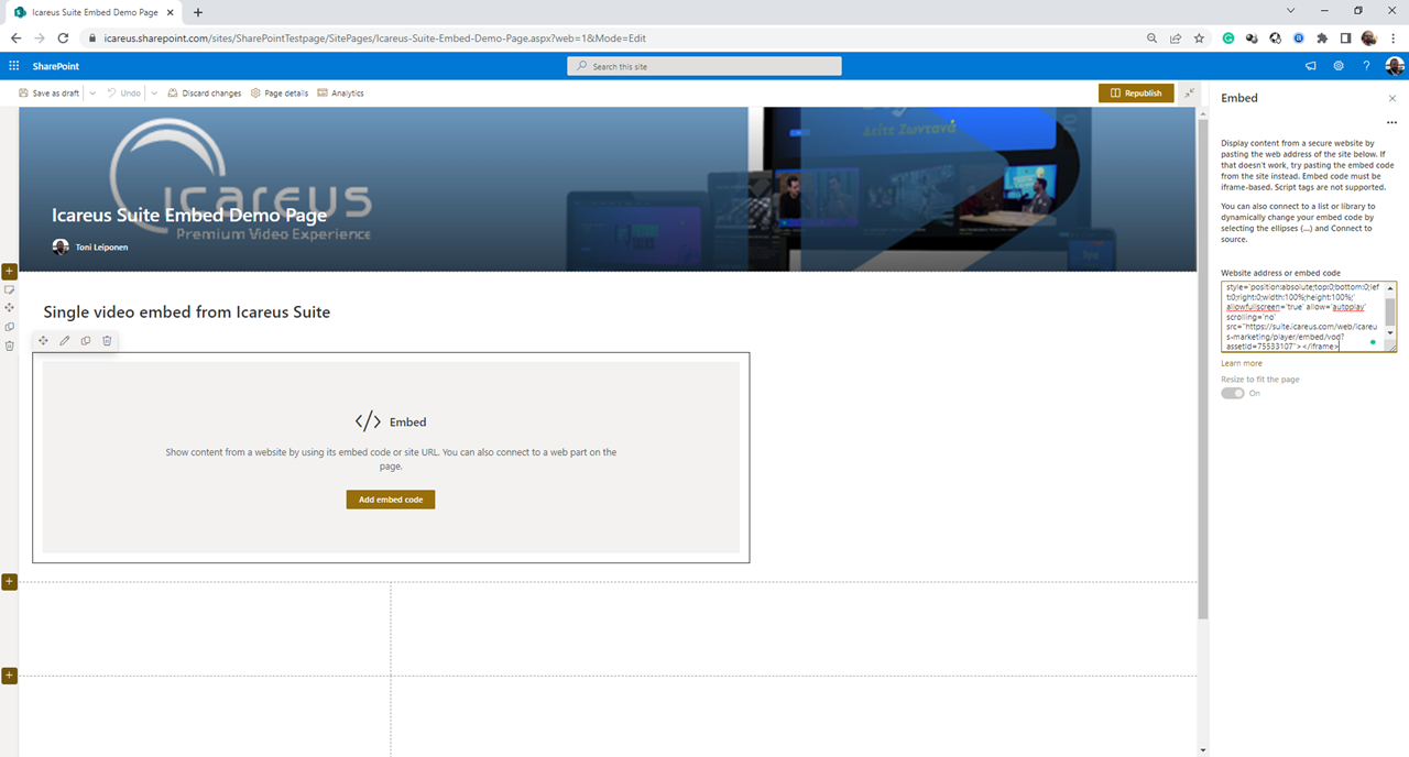 There are two steps that needs to be done when embedding content from Icareus Video Cloud to SharePoint: