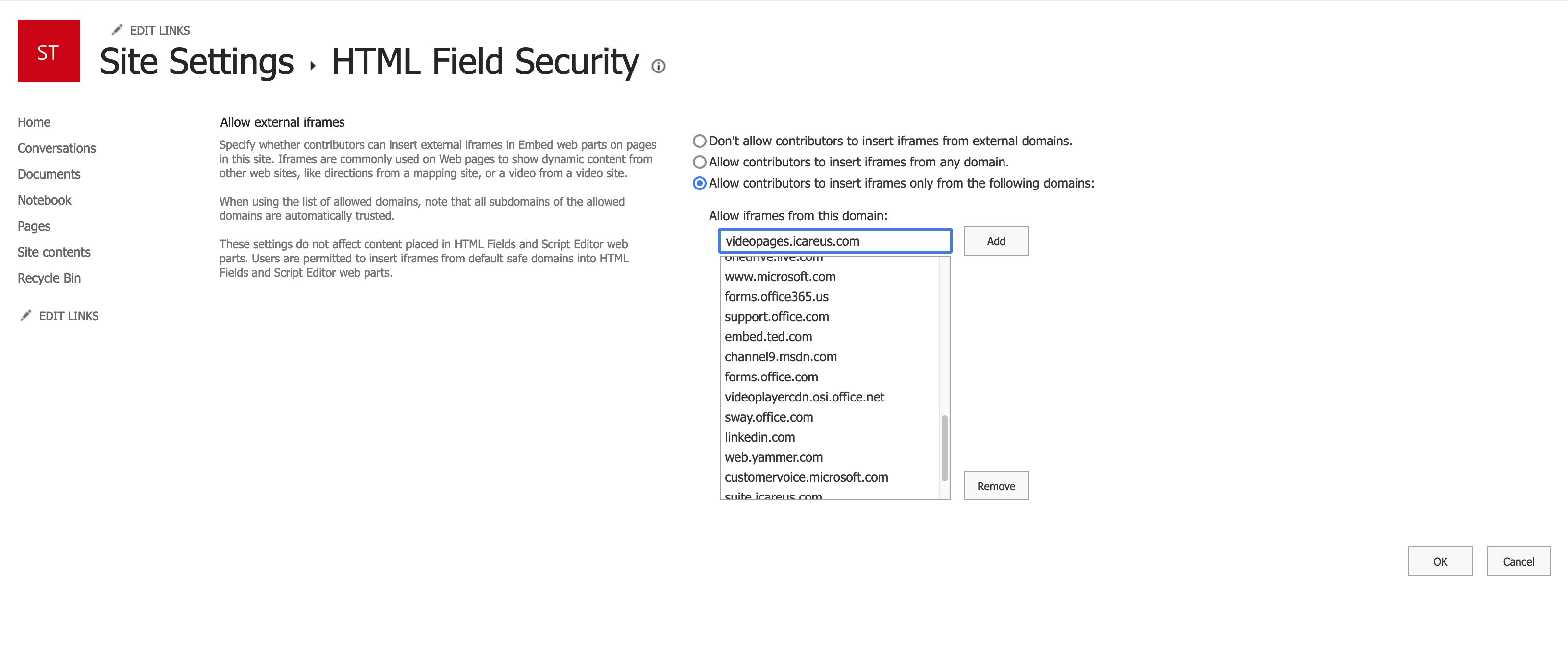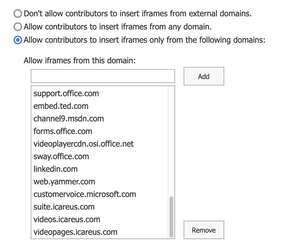It will display the list of websites from which you are permitted to embed content into your Microsoft SharePoint page. Enter the following domain URLs into the text field: