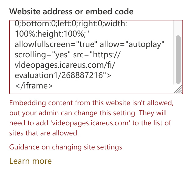 To embed videos/pages into your SharePoint pages, the SharePoint page owner must enable embedding from the Icareus Suite web address. If this step is not completed, you will receive the following notification when attempting to embed: