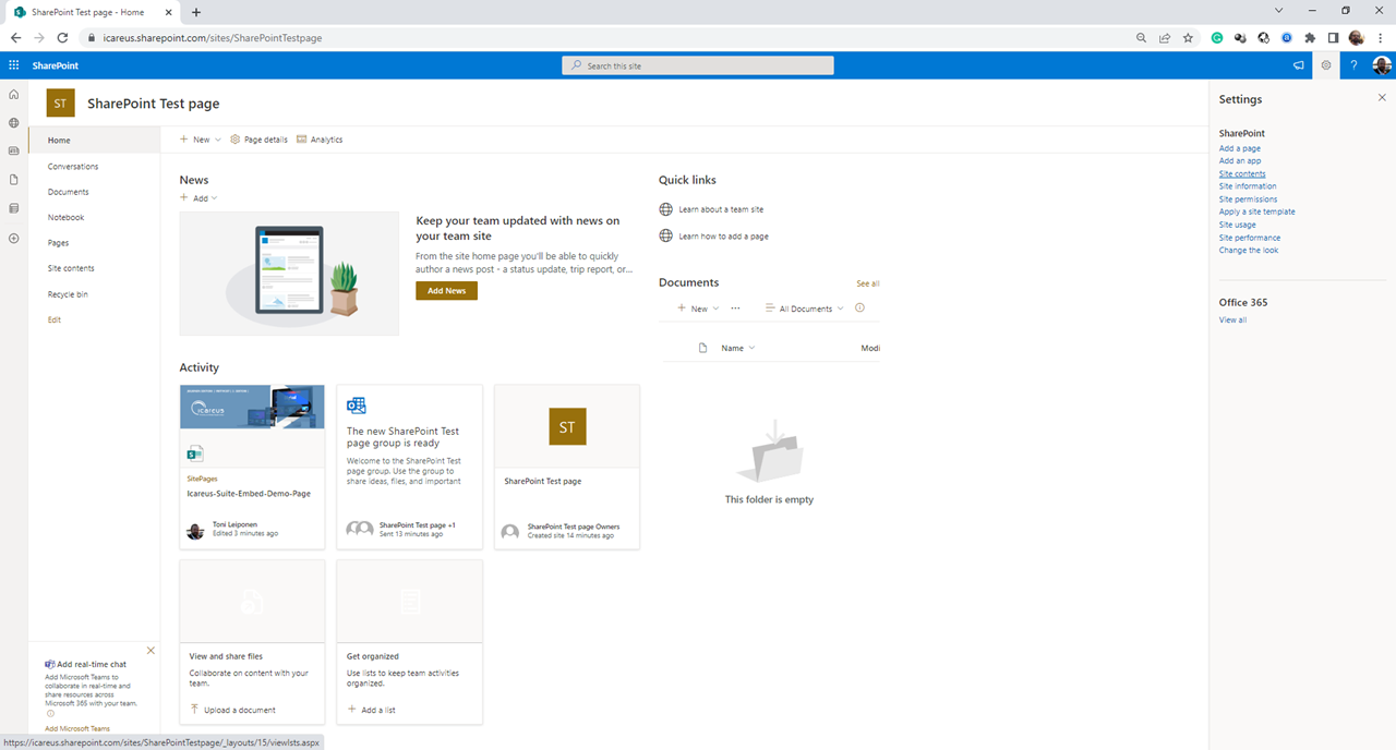 You can change the settings on allowing Icareus' videos by selecting "Site contents" from the "Settings" menu from the top right corner of the SharePoint page you want to embed those videos to: