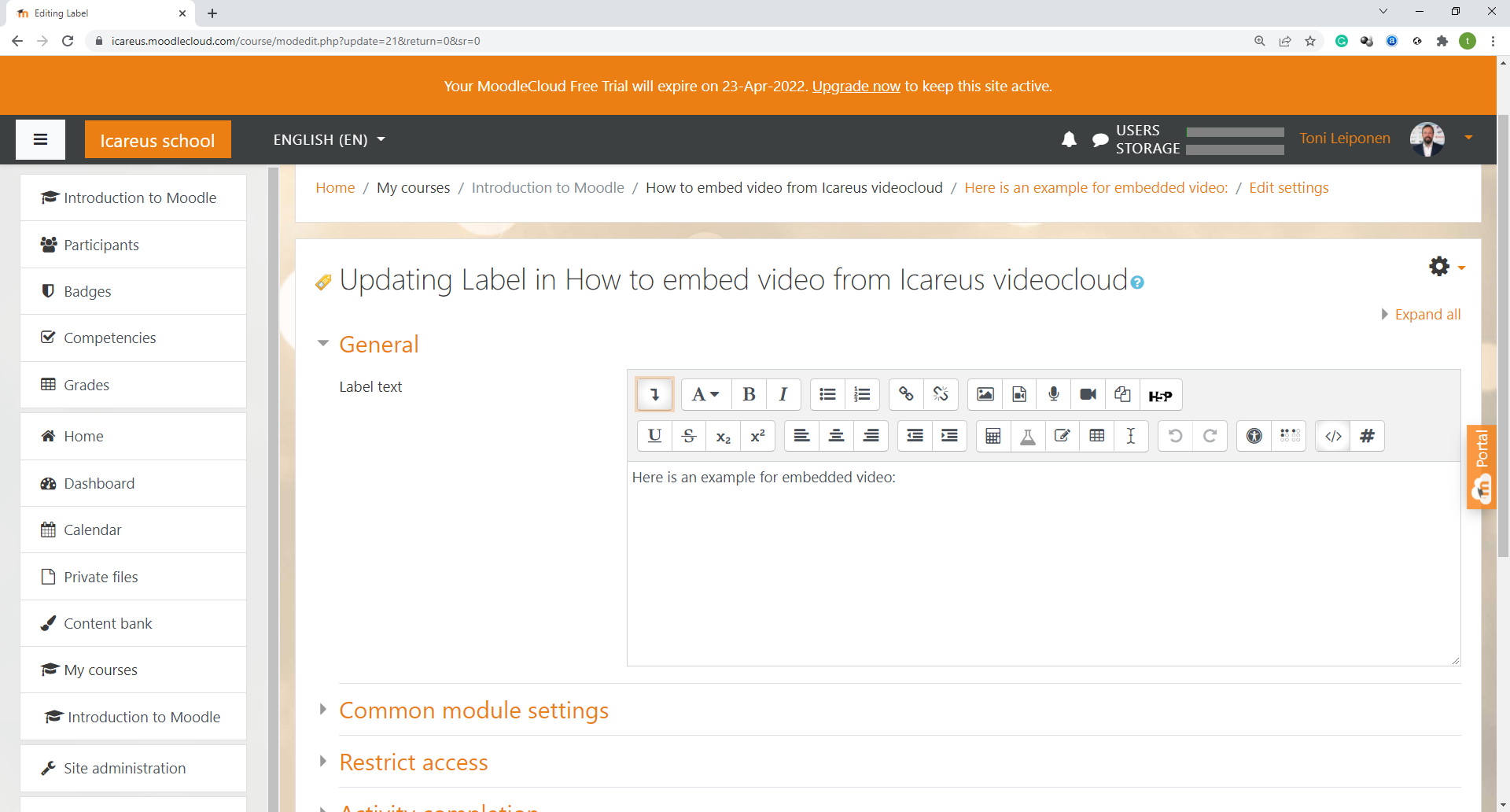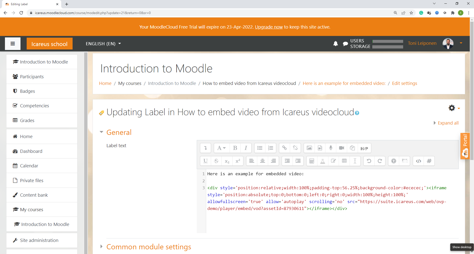 To embed videos to your course material, please login to your Moodle environment as administrator.