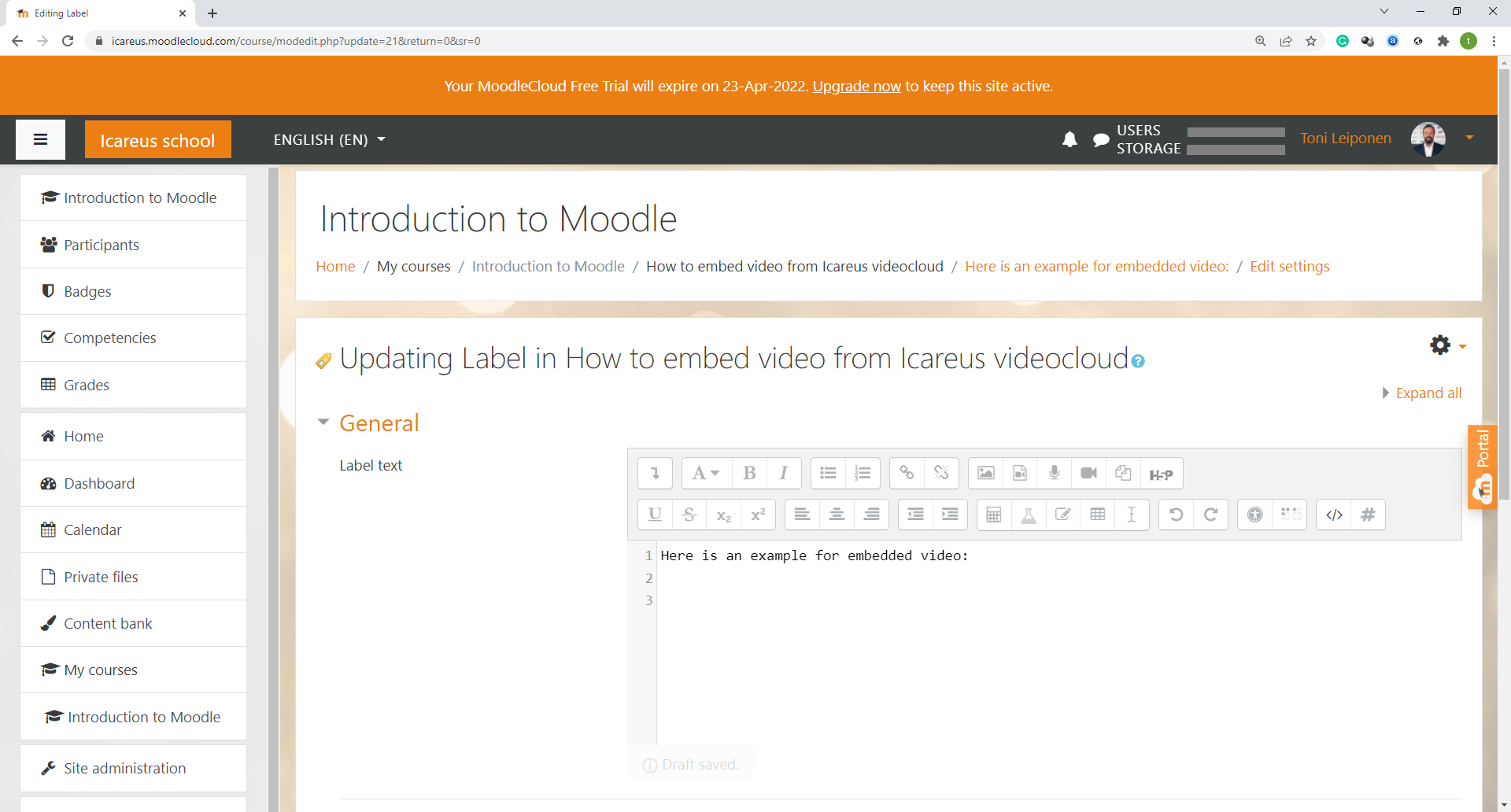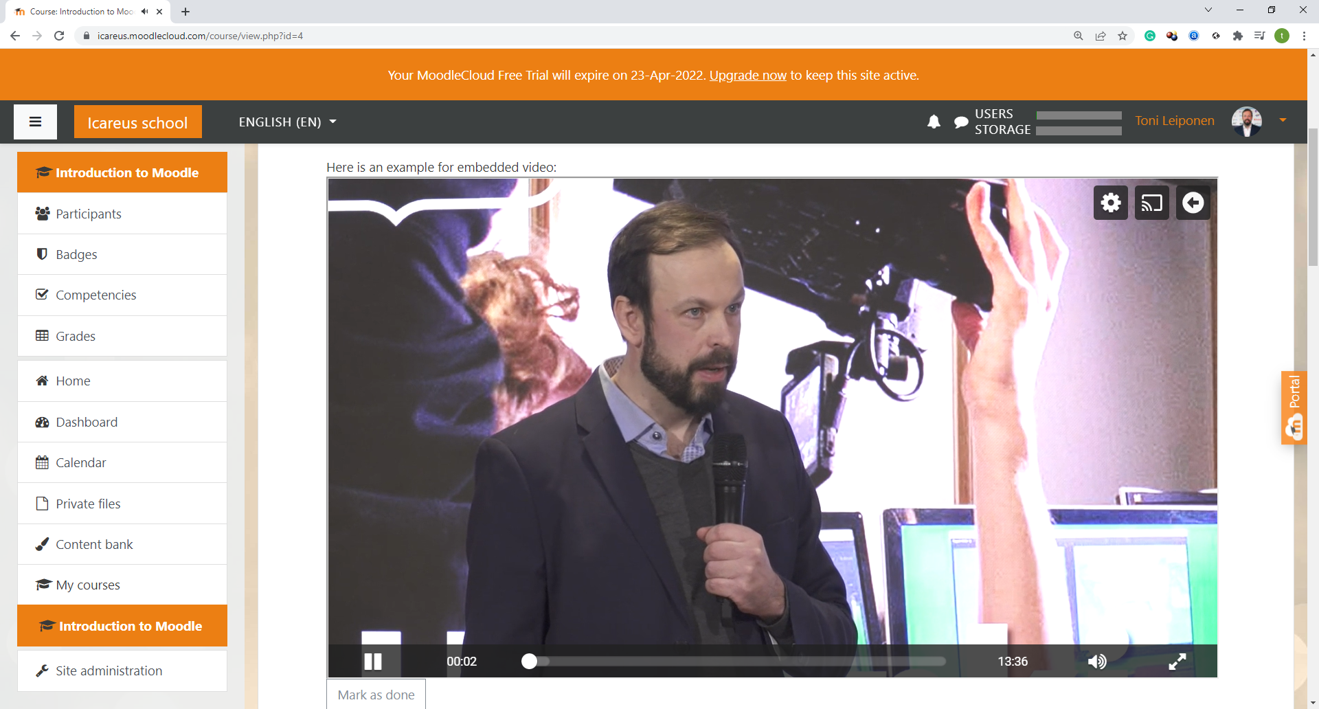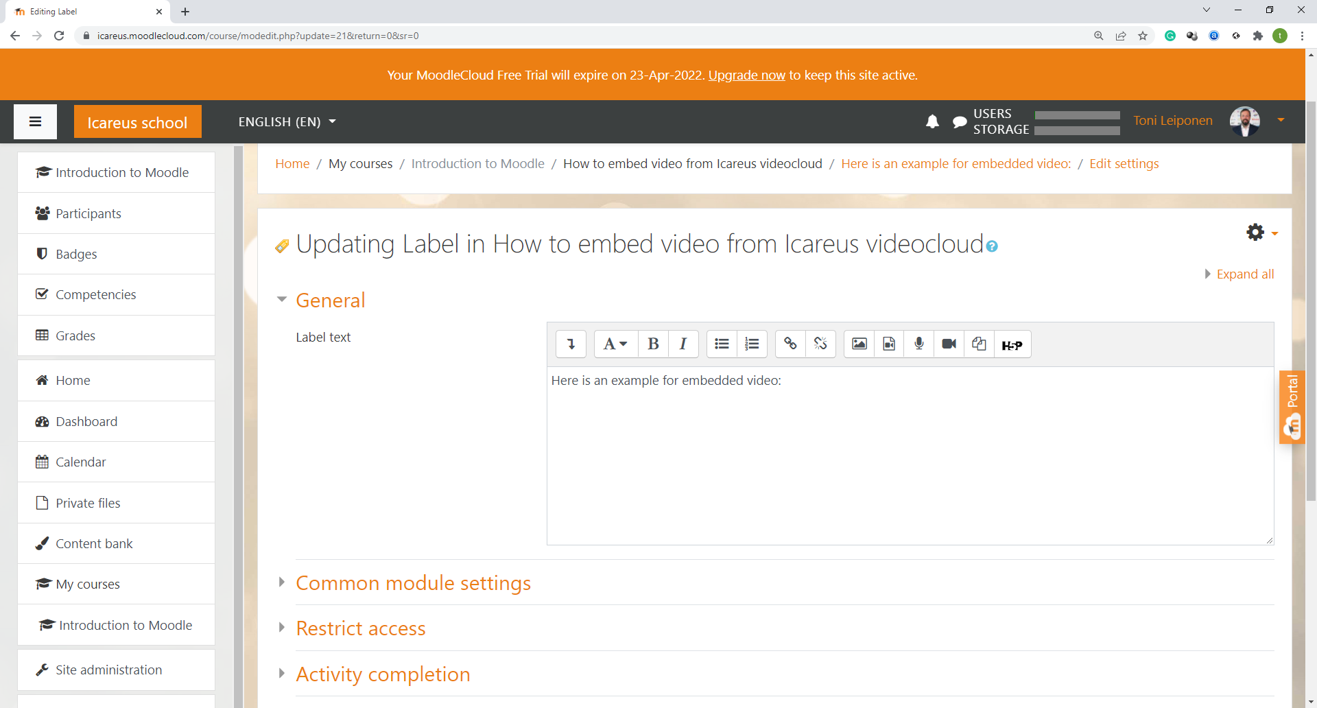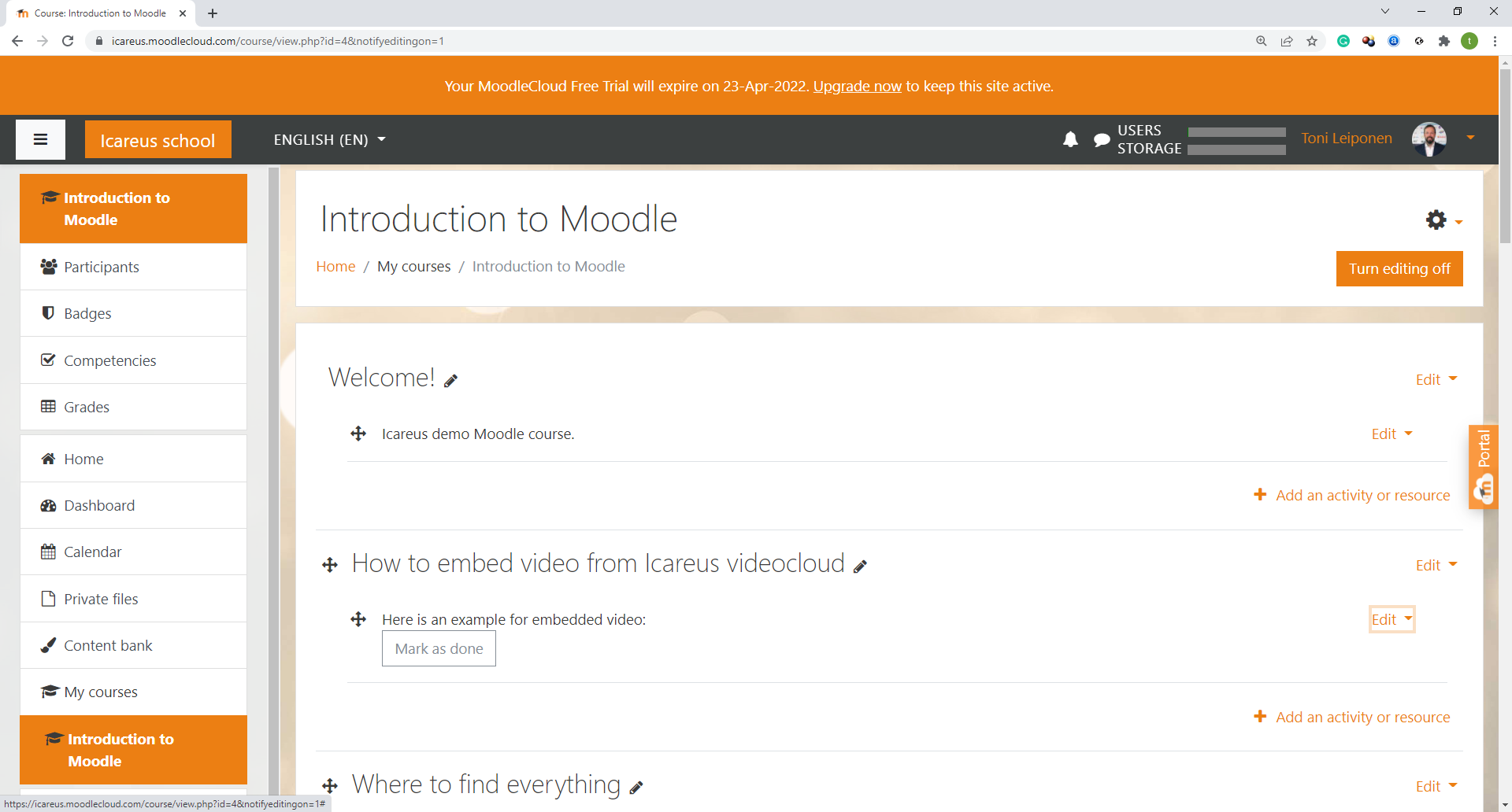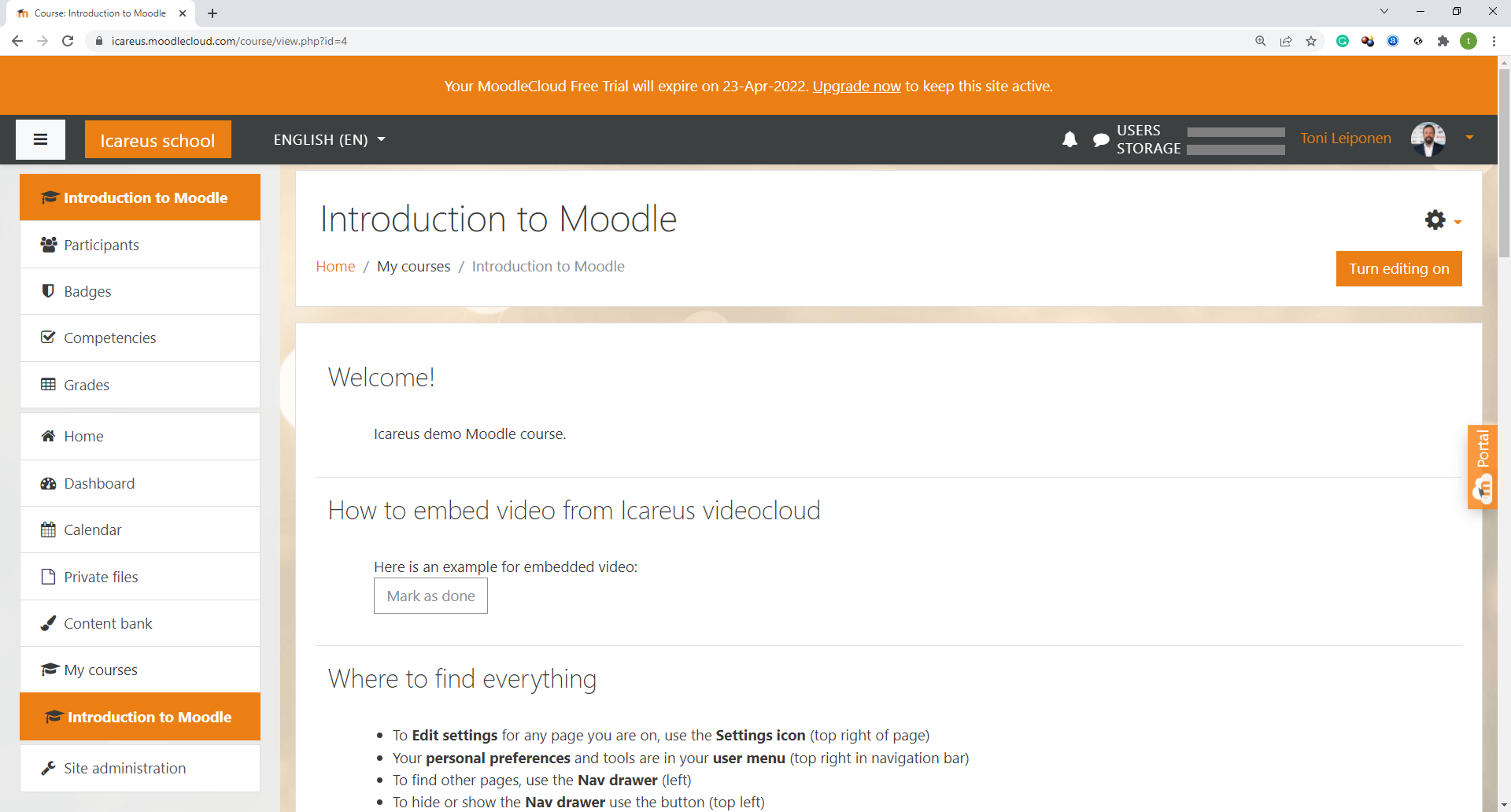 In the image below you can see Icareus Moodle Learning environment: