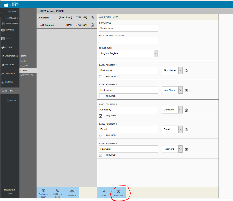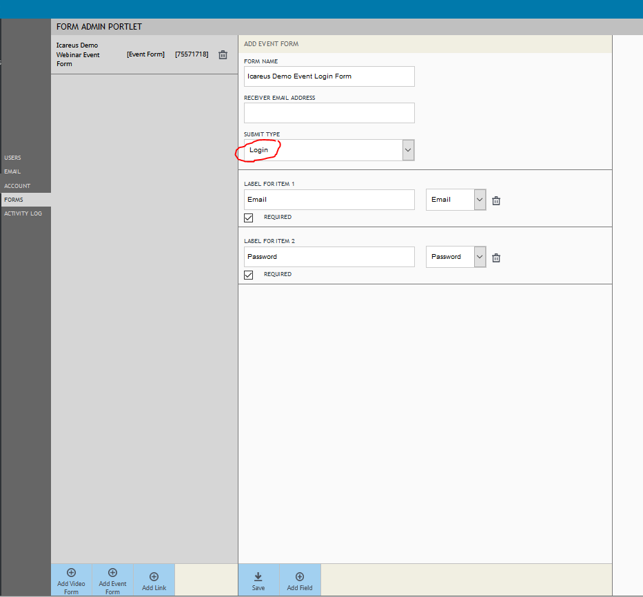 5. Then you can add the form fields by clicking "Add Field". This time you can only enter e.g. Email and password