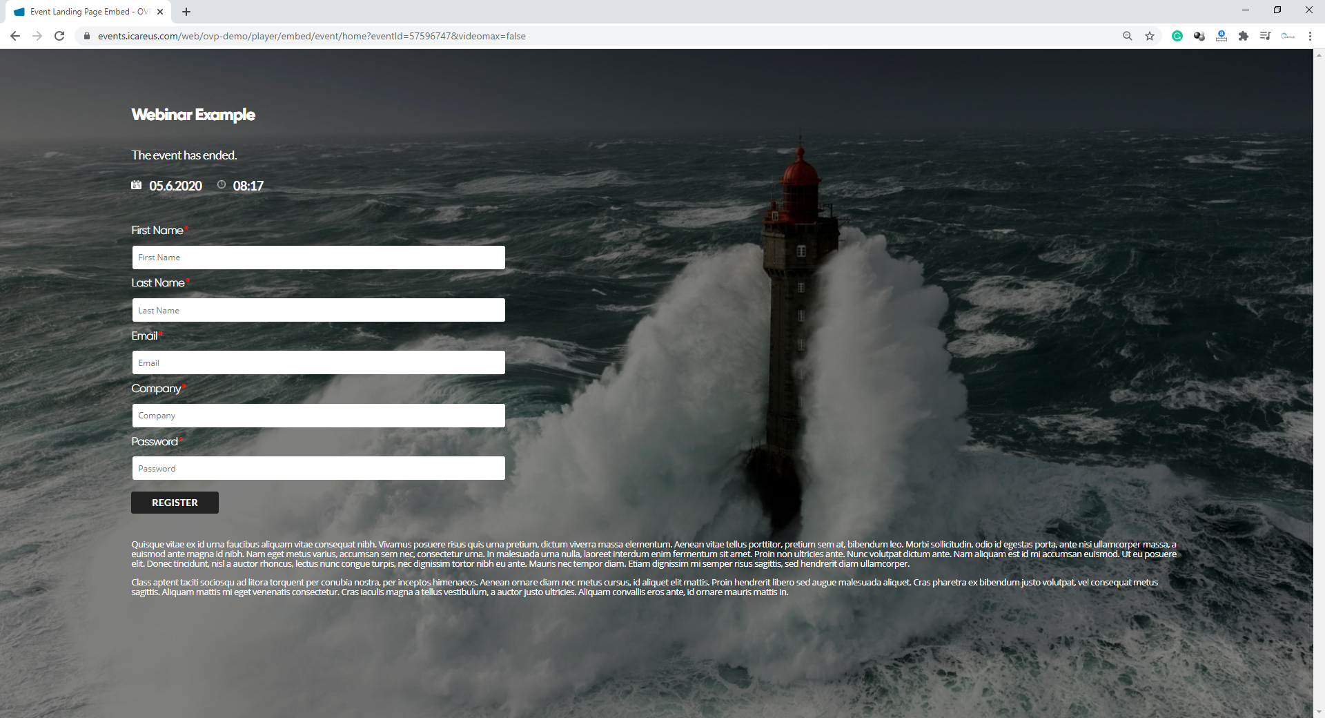 When you open the Event URL you can see the event landing page with Login form ready: