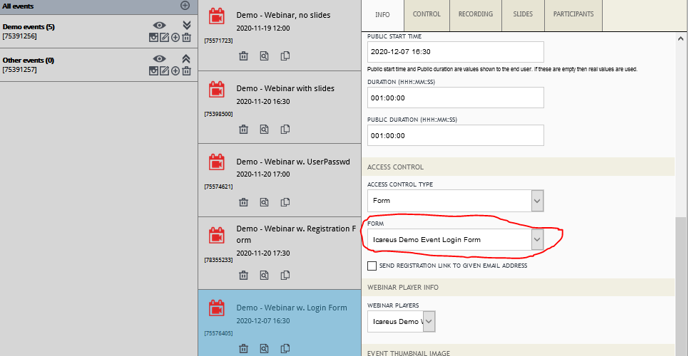 Then, return back to your Events and select from Access control the required Form: