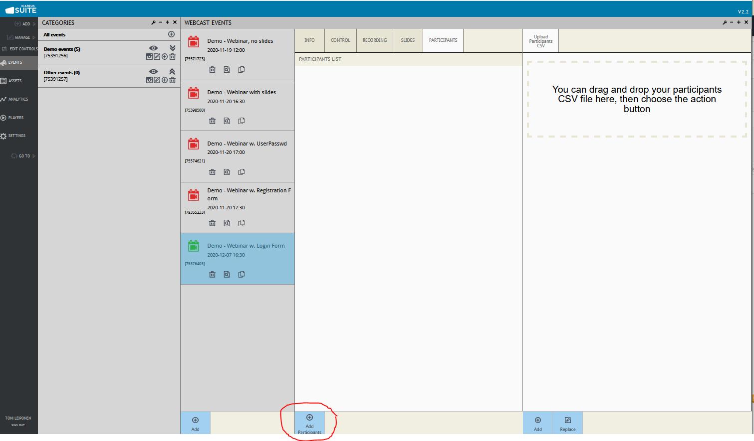 At the bottom of the page you need to click the "Add Participants" button, which opens an area to Drag & Drop a CSV file. An example CSV file looks like this: