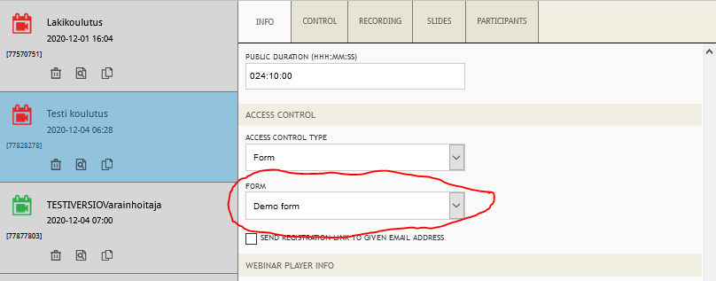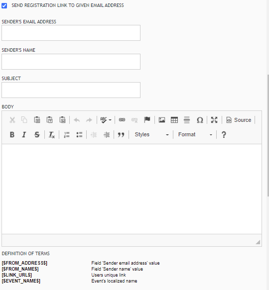 If you select 'SEND REGISTRATION LINK TO GIVEN EMAIL ADDRESS,' the system instead sends an unique link to the given email address, but is not directed to the event itself even if the event is going on. User can enter the event by clicking the received link. There is no need to register again. After selecting this checkbox you will need to fill in the information of the email to be sent.