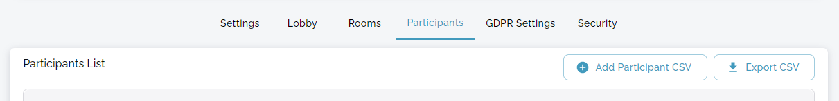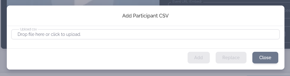 Clicking the "Add Participant CSV" button opens a modal for uploading a CSV file. Drag & drop the file to the upload area or click it to find it through the file dialog.