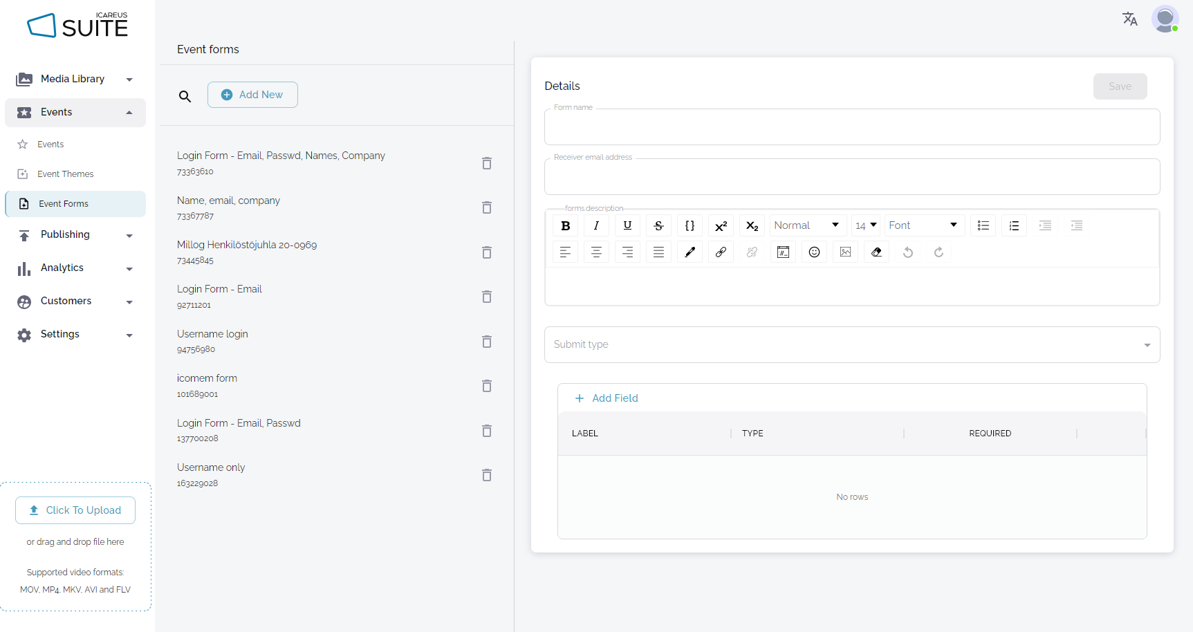 - Click the "Add New" button to create a new form