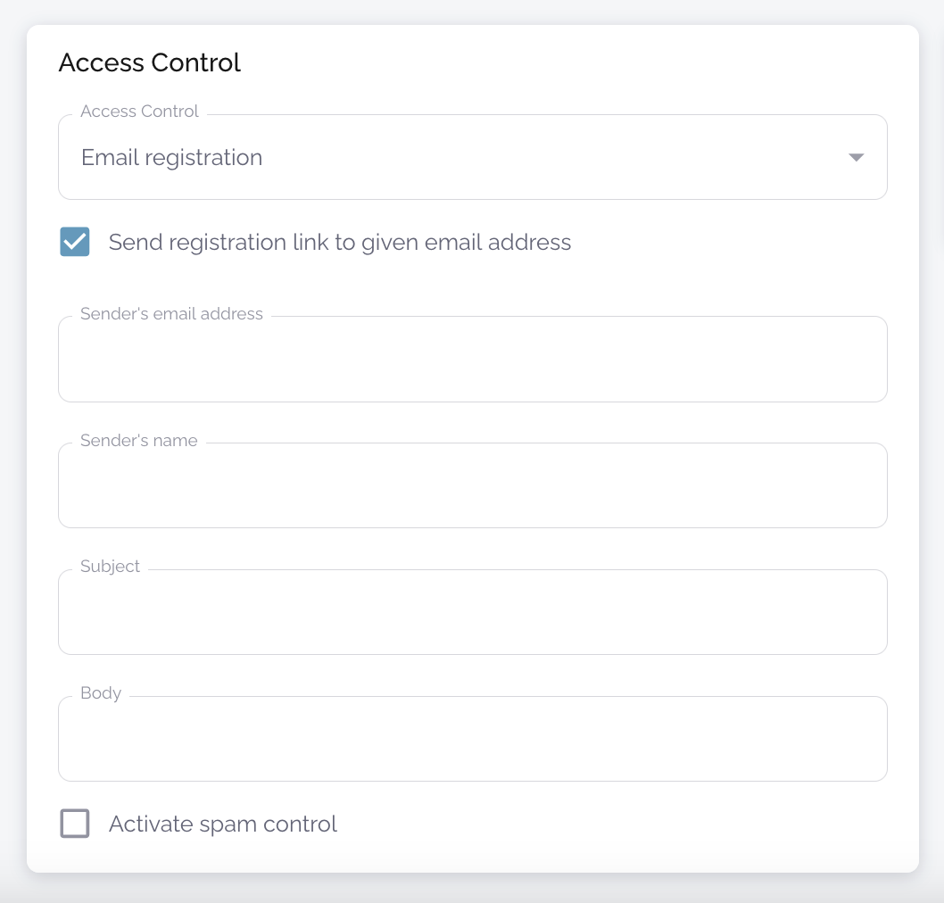 If you check the box "Send registration link to given email address" the system instead sends the viewer an unique link to the given email address, but will not direct them to the event itself even if the event is going on. The viewer can enter the event by clicking the received link. There is no need to register again. After selecting this checkbox you will need to fill in the information of the email to be sent.