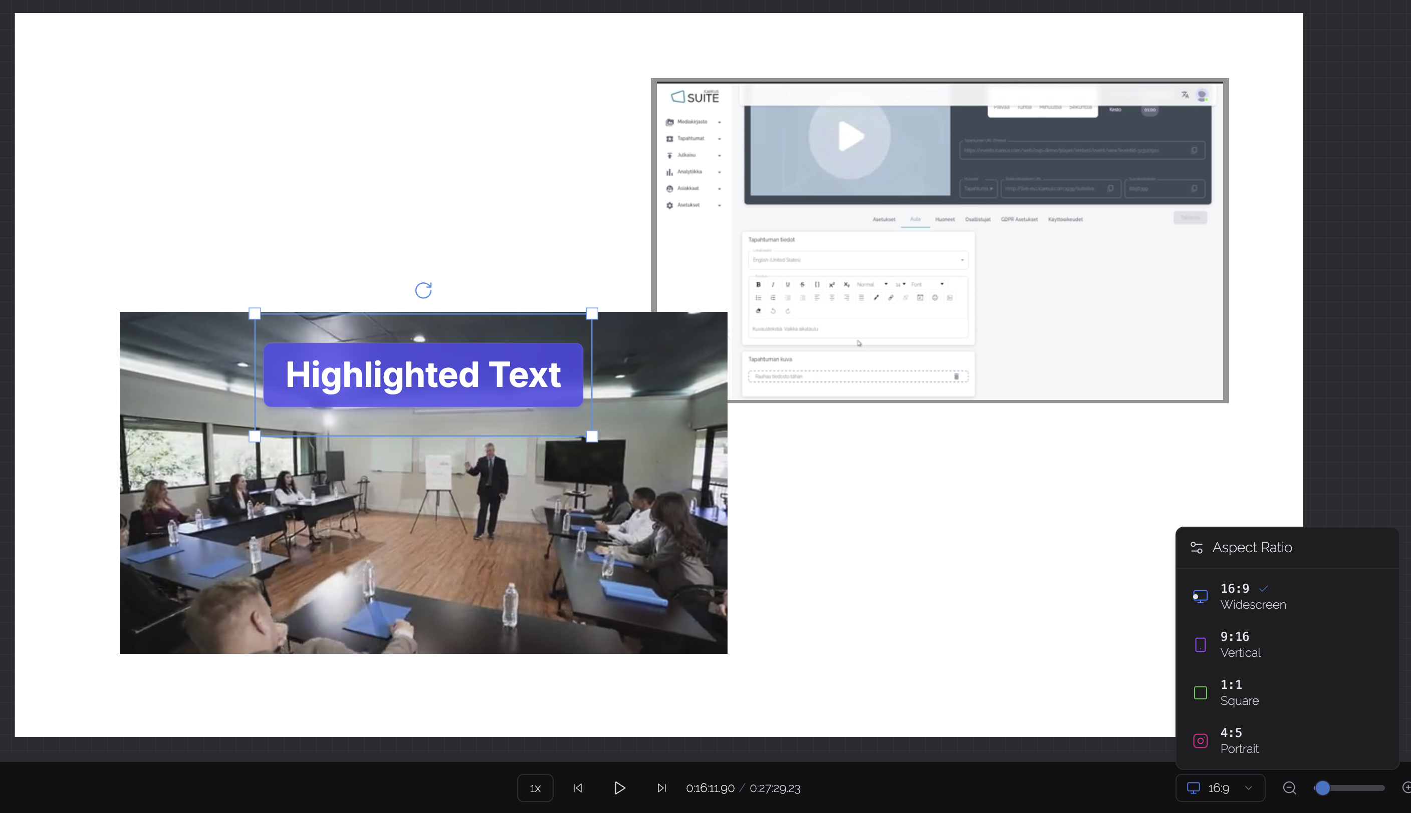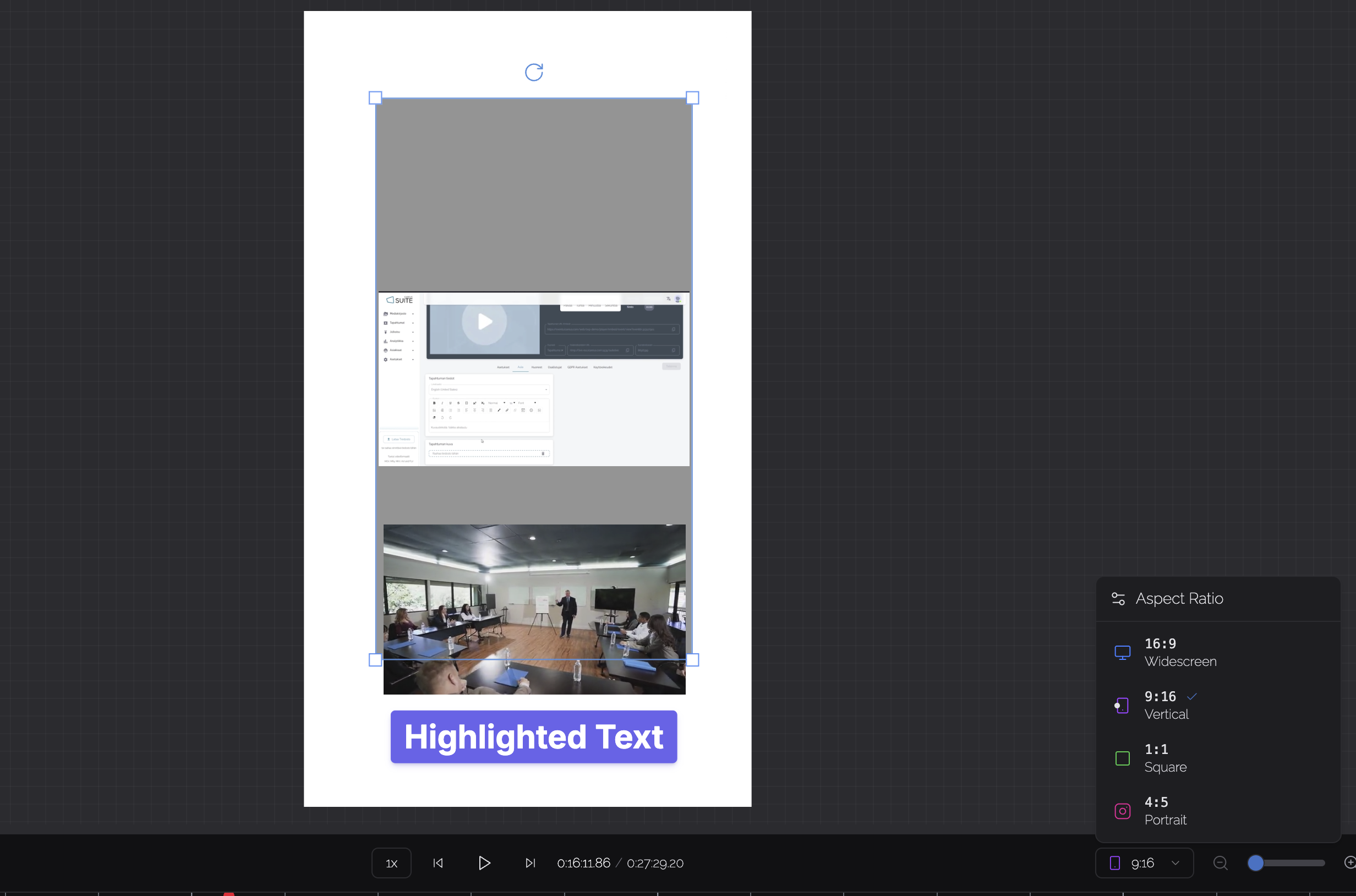 Changing the aspect ratio updates the preview canvas and affects the exported video.