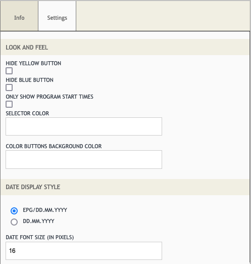 HbbTV Channel Weekly EPG Shows weeks EPG (Electronic Programme Guide) application. CONFIGURATION Field Data Type Comments Background Image Image File Application background image Up / Down Arrow Image File Image shown as up/down arrow, when ...