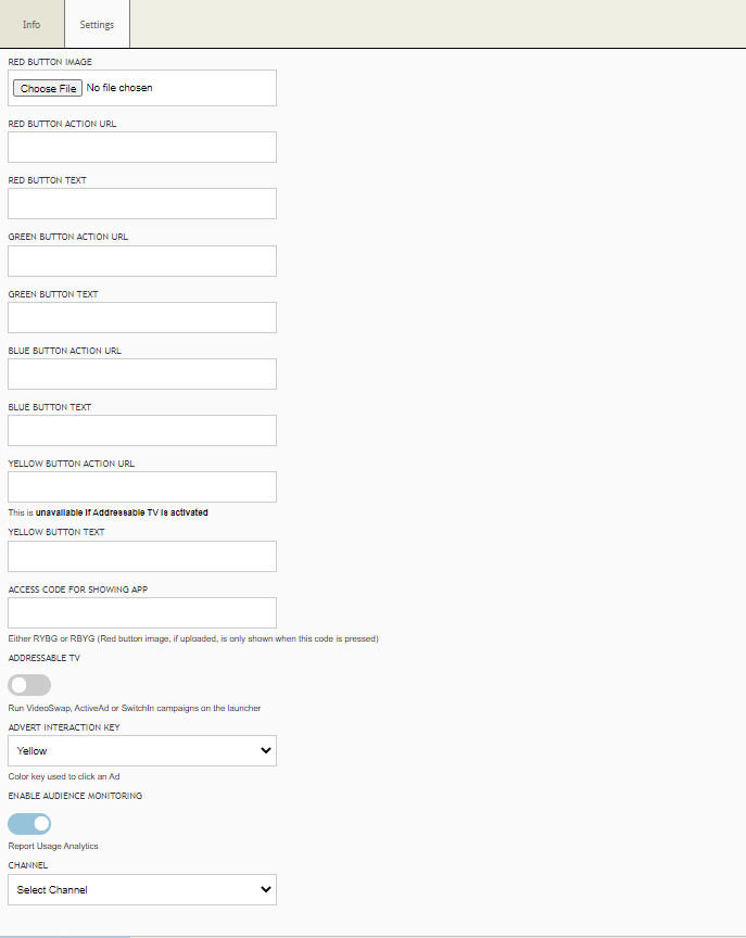 Yellow Button Action URL | String / URL | URL to move when user presses Yellow button. This is disabled if Addressable TV is activated |