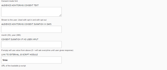 Audience Monitoring Consent Text | String / Textarea | Text shown for user in opt-in or opt-out -options in Audience Monitorin |