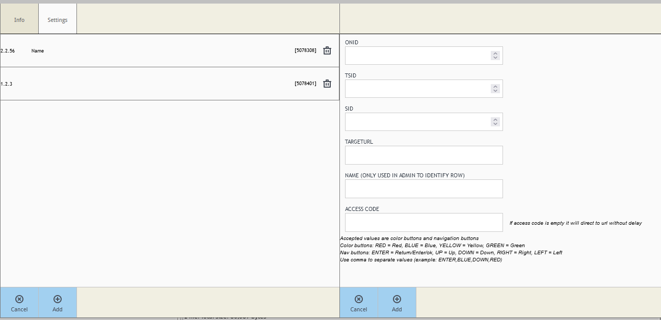 Access code is a color or navigation button combination string. If this field is left empty then user is moved to targetUrl as soon as possible and without any action from the user.