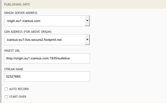 - Add the Icareus Streaming server URL to output Address: rtmp://origin.eu1.icareus.com:1935/suitelive