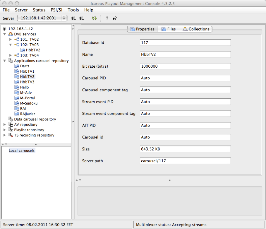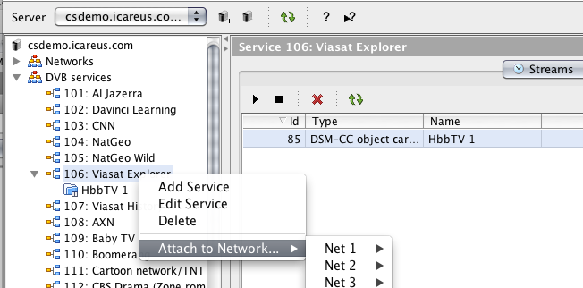 The basic idea is to add DVB Services to a Network and by selecting Carousels and AITs for these DVB Services manage the distribution of TV Applications on different Networks. To output a e.g. HbbTV Application the following steps need to be done: