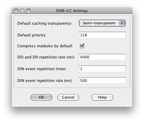Default caching transparency Default caching transparency for object carousel modules, used when creating new carousels in PMC. Default priority Default priority for object carousel modules, used when creating new carouselsin PMC. Compress modules by default If this setting is enabled, object carousel modules will be compressed by default when creating new carousels in PMC. DSI and DII repetition rate Repetition rate of Download Server Initiate and Download Info Indication in data and object carousels, measured in milliseconds. DIN event repetition times How many times to repeat "Do it now" stream events in carousels. DIN event repetition rate Repetition interval for "Do it now" stream events in MHP carousels, measured in milliseconds. |