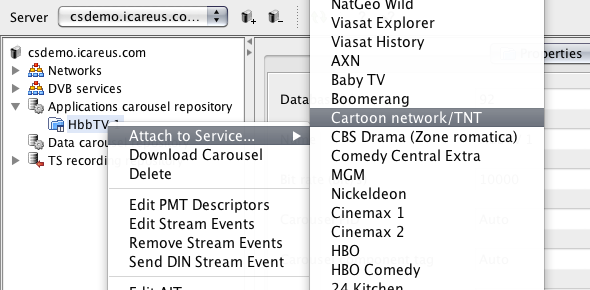 DVB Services hold the actual TV Applications (HbbTV, MHP, MHEG-5, etc.) and they should be added to a Network from the DVB Services tree. See screenshot 3 on the right. Attaching Carousels with AIT and Applications to DVB Services is also done by right clicking the desired Carousel as shown on screenshot 4 right. |