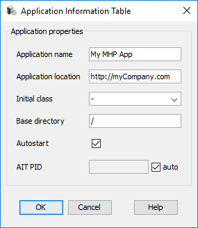 It includes the name of the application, AIT PID, initial class (for example application.TheXlet) for Java Applications, base directory for the application, component tag and an autostart option.