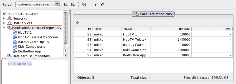 On Icareus Playout, Applications are managed as part of DSM-CC Carousel. One carousel by default contains one Application, although it is possible to add Applications to a carousel by editing the AIT table of that carousel.