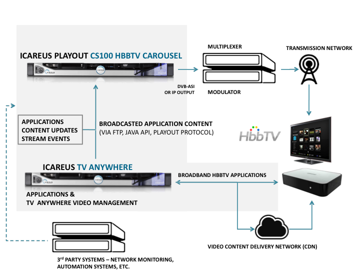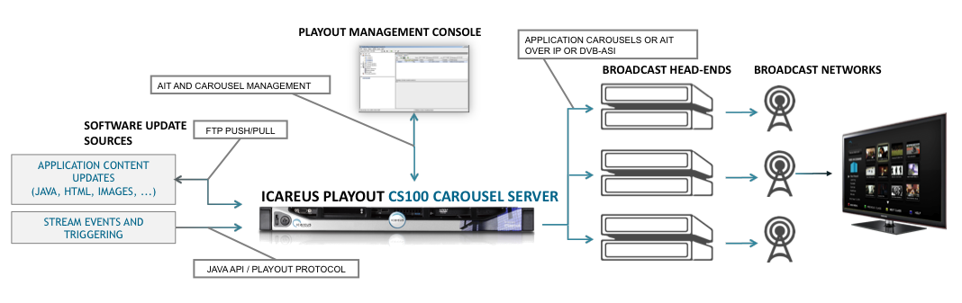 Icareus Playout CS100 Carousel Server allows the building and supervision of high quality value-added television services by multiplexing data in real-time. The data can be received from multiple sources: DVB-ASI feeds and IP-networks. All carousels are generated in real-time, and both the carousel content and AIT application signaling can be updated dynamically.