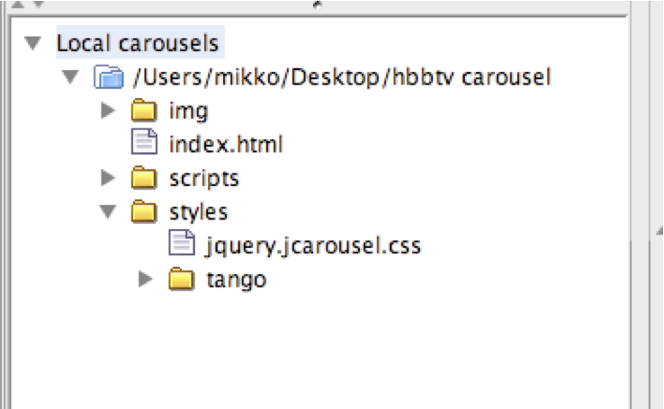 A very common scenario is that one application is used frequently over the time. It is thus handy to have a location where one can collect these frequently used carousels. This place, called carousel tree, is shown in the lower left corner of the window. To add an application to the carousel tree, right click the tree and select New carousel. A dialogue appears that prompts you to point the root directory of the carousel. The other way of adding an application is to drag a directory from your file manager and drop it over the carousel tree. You can remove carousels from the tree by right clicking the carousel and selecting Remove carousel. This does not remove the files from the file system, only from this favourite list. |