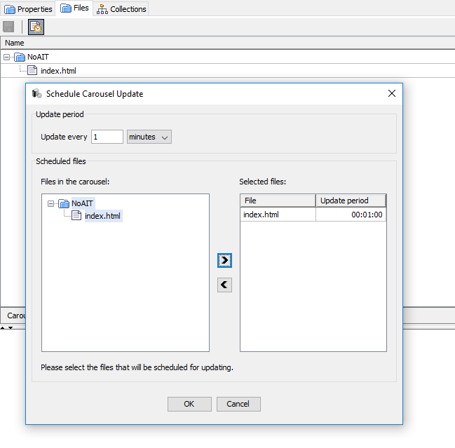 Sometimes it is necessary to update a carousel periodically. A ticker application, for example, might update its news content every 15 minutes. To automate this kind of periodical updating, PMC offers a scheduled update system for carousels. To edit scheduled updates for a carousel, right click the carousel content tree and select Schedule Carousel Update. In the upper part you can configure the period of updates, given in various time units. In the lower part you can select the files that are to be scheduled for updating. The list to the left contains all files in the carousel, the list to |