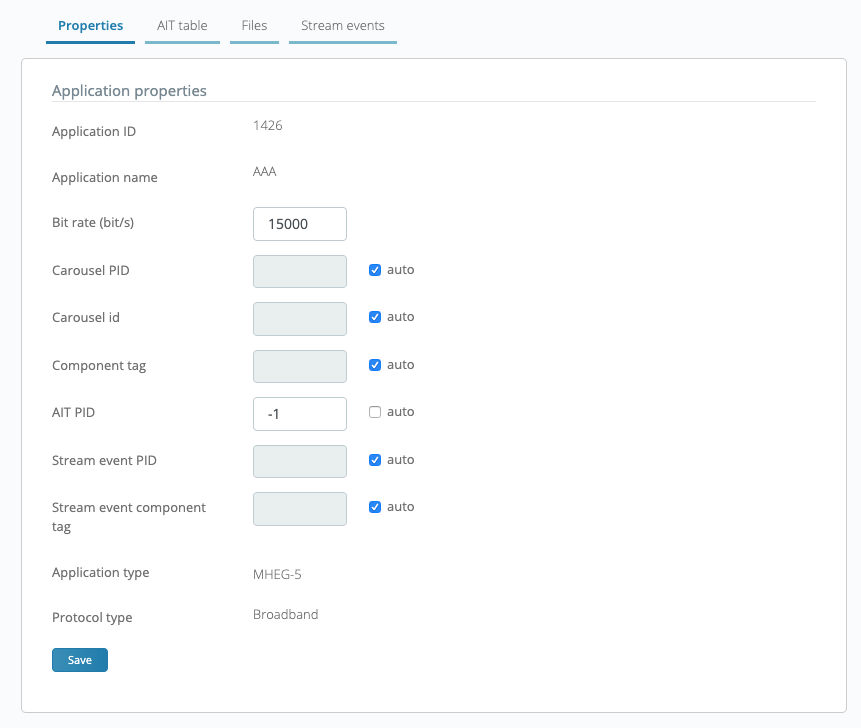 Bit rate (bit/s): Output bitrate of this application, affects only if a DSM-CC carousel is included.