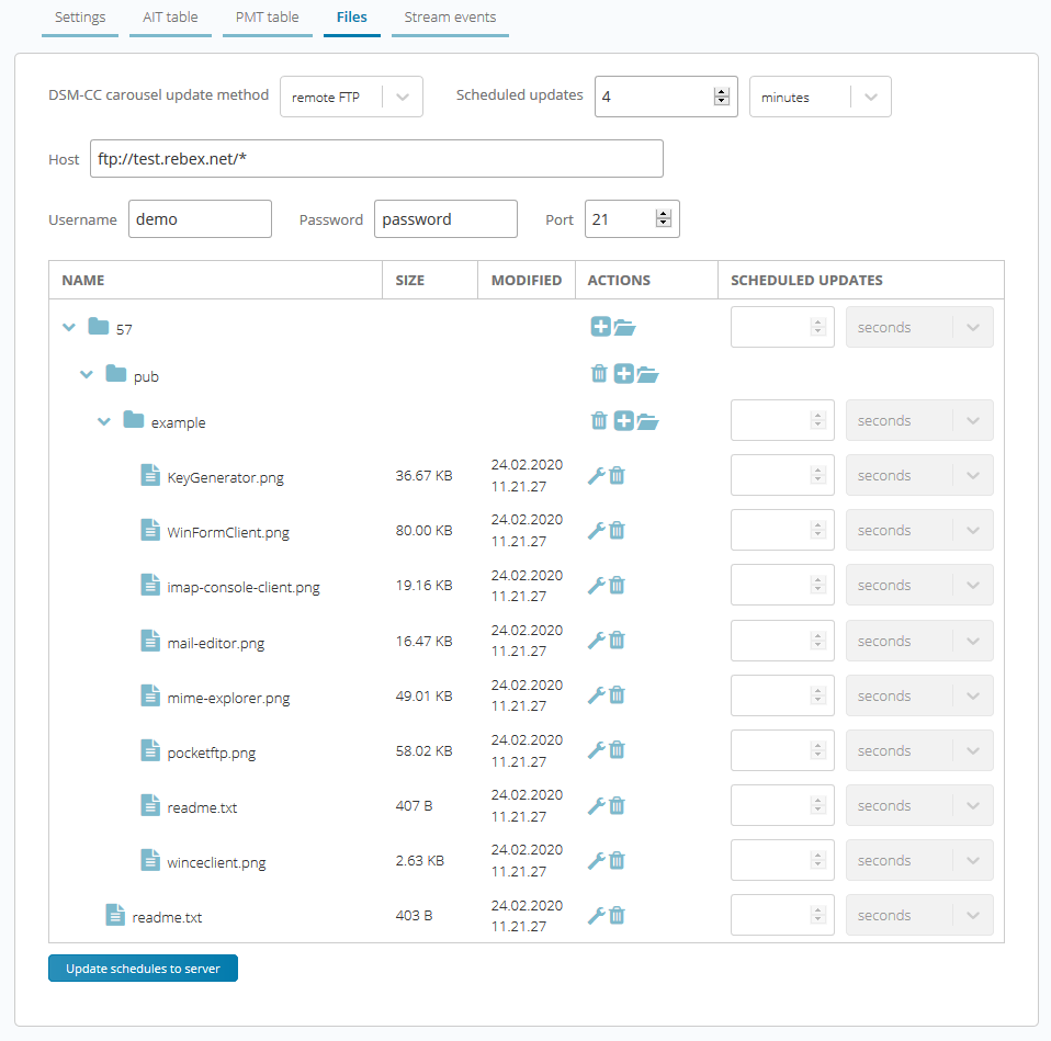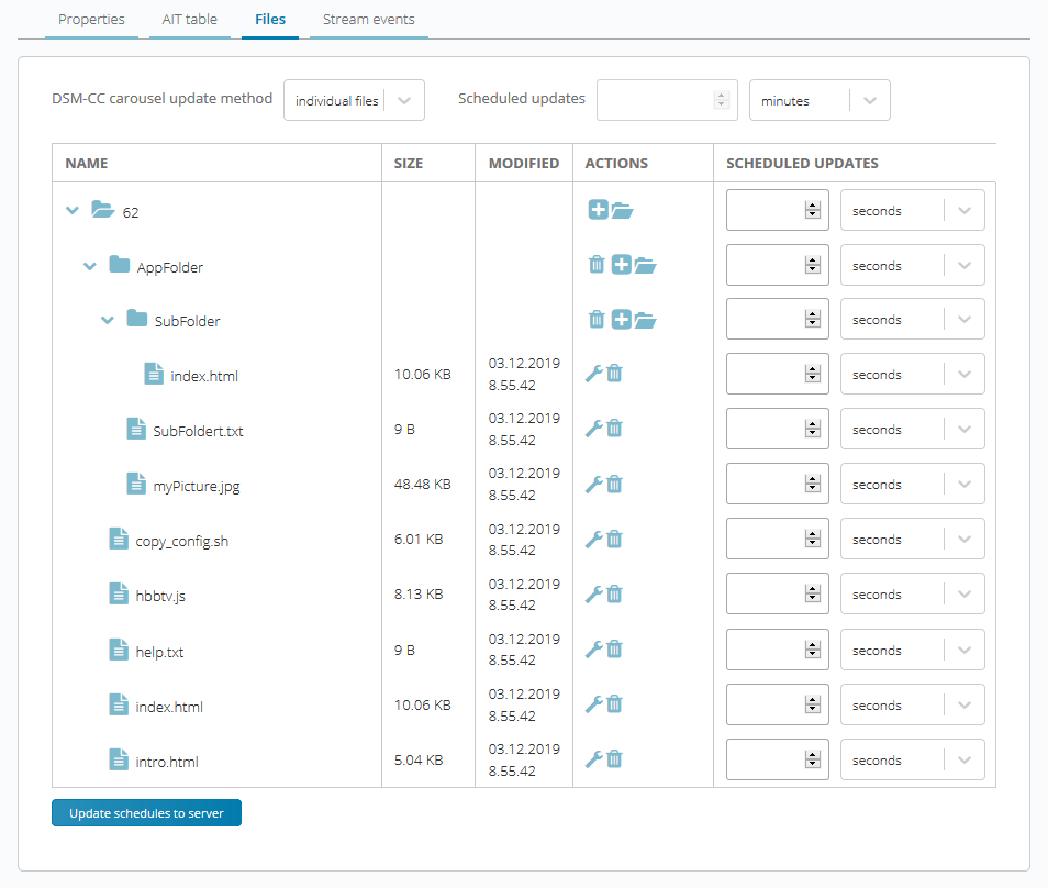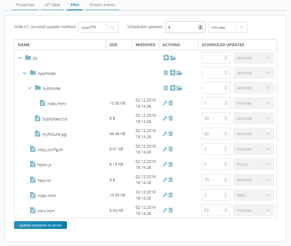 The broadcasting of the carousels is managed per DVB service and utilizing timers, it may be fully automated and controlled also from 3rd party systems.