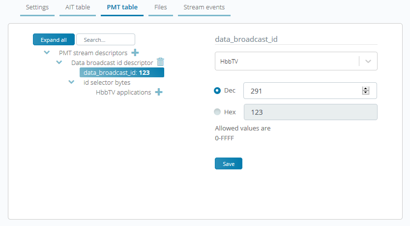 This tab provides an editor for the PMT table. When adding an PMT for a carousel, the Icareus Playout asks only basic information about the application and fills the rest of the PMT with default values.