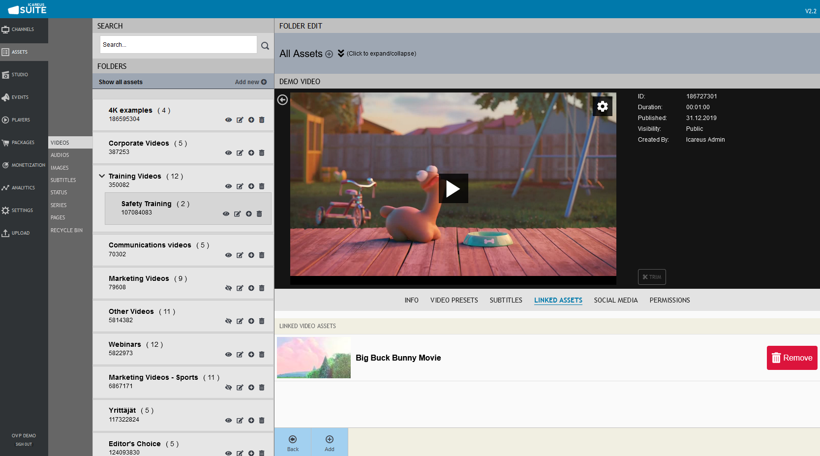 Info is the main view when a video asset is selected. It enable admin to see the status of the video, preview it and manage its metadata as shown below.
