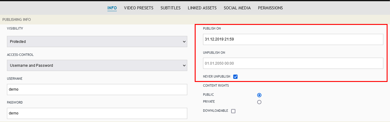In the case of Icareus Video cloud, video archiving is easy. When you want to remove a video from public viewing, but you don't want to delete it permanently, the video publishing settings are changed from the Info tab: