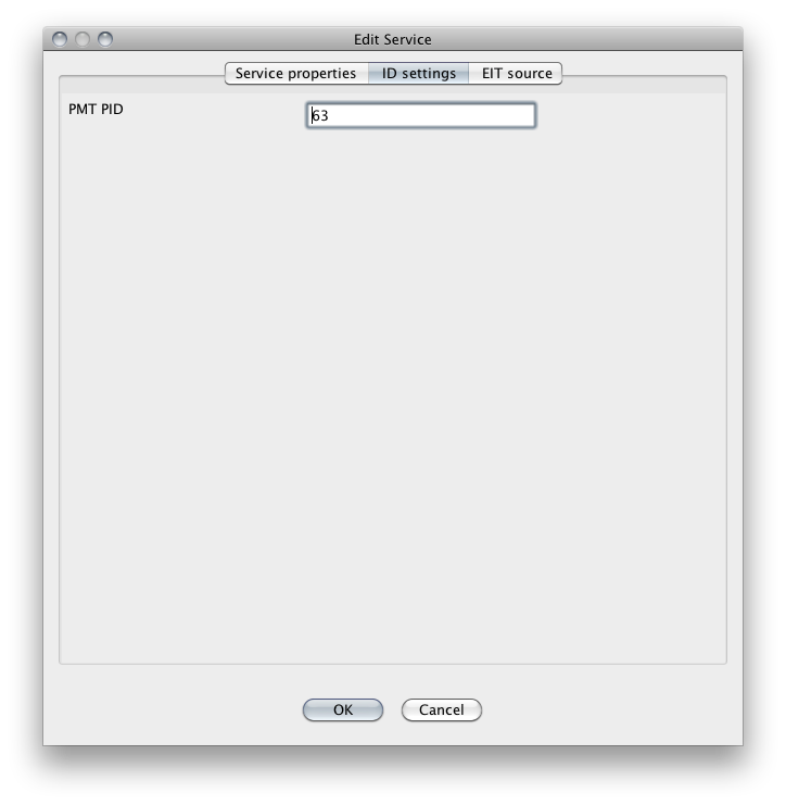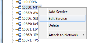 Existing DVB Services are modified by right clicking the service node of DVB Services tree. It opens an Dialog that enables user to edit the key parameters for a Service as described below. |
