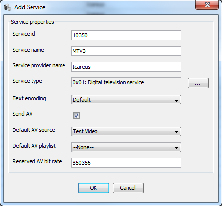 Text Encoding: Defines the text encoding for the service used in EIT Send AV: Specifies if service should contain Audio/Video stream Default AV source: Audio/Video source from the 'AV repository' Default AV playlist: Audio/Video playlist from the 'Playlist repository' Reserved AV bit rate: Bit rate reserved for the Audio/Video stream |
