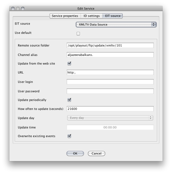 EIT source is the source for the EPG data for this specific service. It is possible to have different source for each service or rely on the default source for all services. To learn more about various supported sources please refer to chapter Managing EIT. In the example on right the source is unique for the service and the source type is XML TV. |