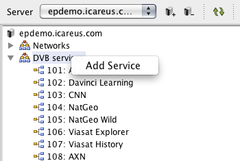 The DVB Services -tree includes Services that have been configured on the server, but not necessary used in any of the outputs. In order to output the PSI/SI, EIT or A/V for a Service it must be added to a Network (within the Networks -tree).
