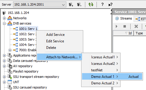 A Service is added to a Network from the DVB Services -tree either by drag-and-dropping it to selected Network or by right clicking as illustrated in the image below.