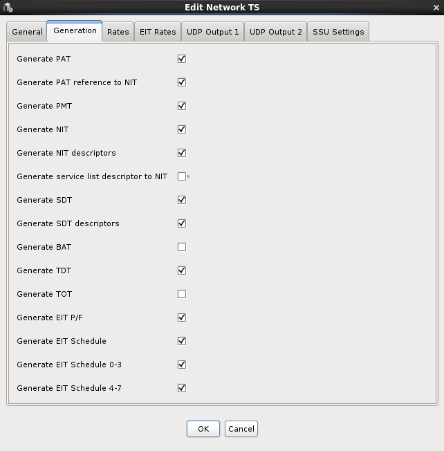 Generate BAT : Enables generating Bouquet Association Table. Generate TDT : Enables generating Time and Date Table. Generate TOT : Enables generating Time Offset Table. Generate EIT P/F : Enables generating the Event information table present/following Generate EIT Schedule : Enables generating the Event information table Schedule. Turning this off disables generating the schedule entirely, irrespective of the 2 following options. Generate EIT Schedule 0-3 : Enables partitioning of the Event information table Schedule for days 0-3. The partitioning is defined in the EIT Rates tab. The days 0-3 occupy the first EIT schedule subtable, with table id 0x50 for the actual schedule and 0x60 for the other schedule. Generate EIT Schedule 4-7 : Enables a partition of the Event information table Schedule for days 4-7, and another for the remaining days 8+. If the 0-3 option is selected, but the 4-7 option is not selected, then only days 0-3 will be generated into the schedule. The days 4-7 occupy the second EIT schedule subtable, with table id 0x51 for the actual schedule and 0x61 for the other schedule. |